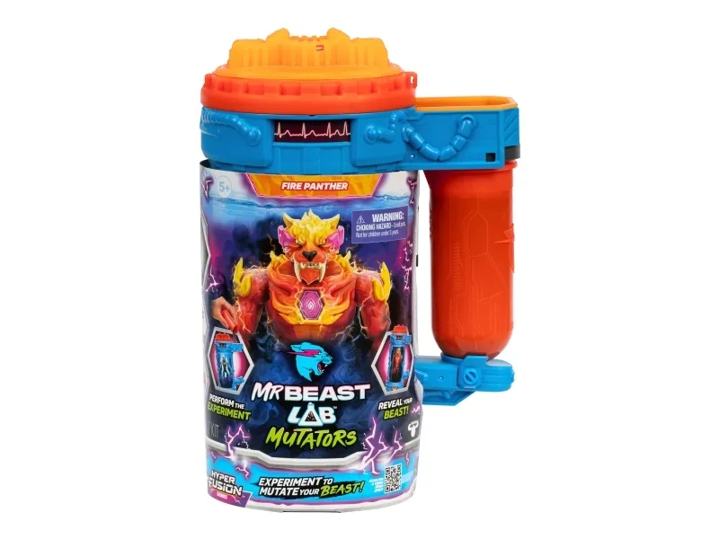 MrBeast Lab Fusion Mutationskammer. Udfør eksperimentet for at skab en sej MrBeast-inspireret actionfigur! Mutant bæstet Flamme Panter er 13 cm høj og har over 20+ bevægelsespunkter! Fra 5 år!