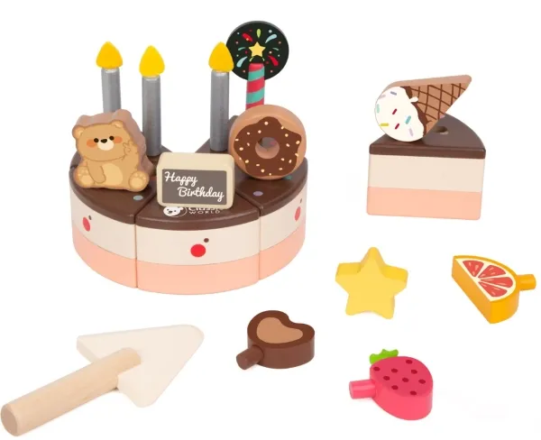 Gør hver dag til en fest med denne smukke chokolade fødselsdagskage i træ fra Classic World. Kagen leveres med lys, pynt og et serveringsredskab, så børn kan fejre fødselsdag igen og igen. Med mulighed for at blæse lysene ud, skære kagen i stykker og pynte med forskellige søde figurer, stimuleres børns fantasi, sociale leg og rollelege. Perfekt til hyggelige stunder med familie og venner. Specifikationer:
