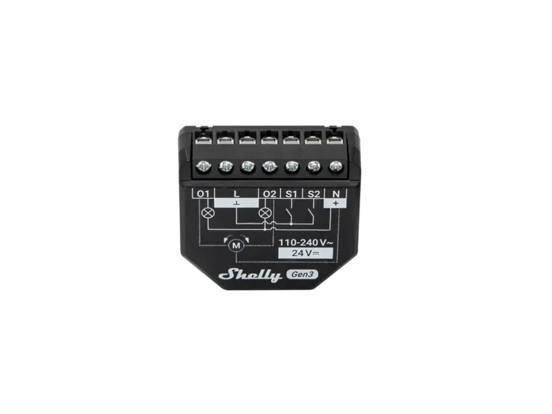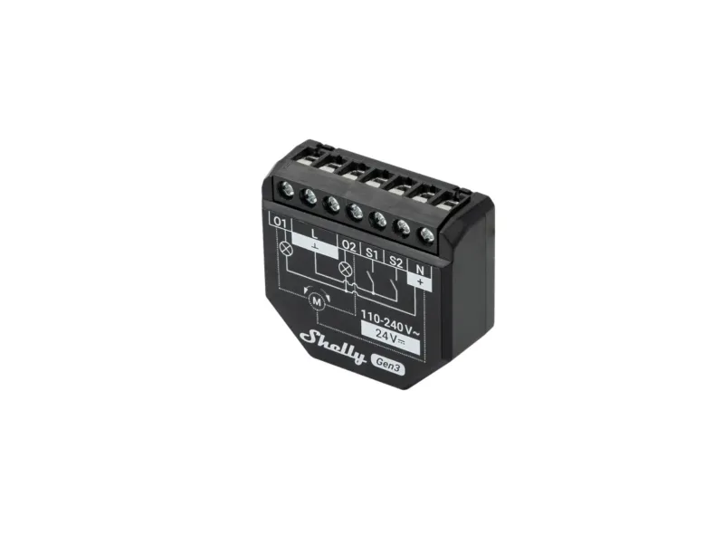 Shelly 2PM Gen3 is a WiFi-controlled 2-channel relay, primarily suitable for automating roller shutters, blinds, awnings, and all two-way AC motors. The two integrated power meters allow for measuring the consumption of each channel separately (PM = Power Metering), making the device also ideal for controlling two channels of lights or two sockets. The device can handle up to 10A per channel and a maximum of 16A in total. Shelly Plus 2PM is designed for installation behind the switch, socket, or lamp outlet and fits in most wall and ceiling boxes thanks to its compact design. Shelly 2PM Gen3 is easily set up and controlled through the Shelly Smart Control app or your preferred Smart Home or Smart Building system. Shelly devices work 100% locally and only require a local network to operate. Shelly can be used alone in the Shelly Smart Control app or with more than 200 partner systems such as Google Home, Amazon Alexa, Home Assistant, Samsung SmartThings, Athom Homey, KNX, and many more. Function Shelly 2PM Gen3 has many applications. It can be powered with 24V DC or 110-230V AC. Shelly 2PM has two switch inputs, which are optional to use. The device automatically measures power consumption on each channel, which can be monitored through the Shelly Smart Control app and easily used for automations. Shelly 2PM can be used for many purposes such as: Two-channel light control, Socket control, Control of roller shutters, blinds, awnings, garage doors, and similar. Connection Shelly 2PM Gen3 can connect to the internet or the local network via 2.4 GHz WiFi. Additionally, the device has built-in Bluetooth like the rest of the Pro, Plus, and Gen3 devices, so it can also be used as a gateway for Shelly Bluetooth battery-powered devices. All Shelly devices work locally without connection to Shelly Cloud, but it is recommended to activate it for easy data storage and increased functionality. The devices can also communicate via MQTT, HTTP, and WebSocket. All support TLS. Hardware The device is equipped with generation 3 hardware, which includes the powerful ESP-Shelly-C38F CPU with 8MB flash. This makes Shelly 2PM Gen3 future-proof and allows for scripting functions and virtual devices for advanced and customized functionality.