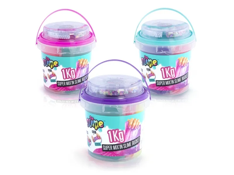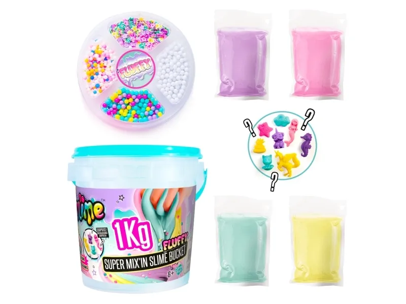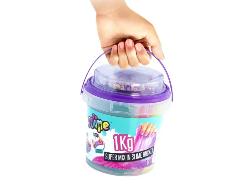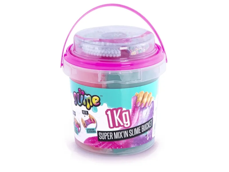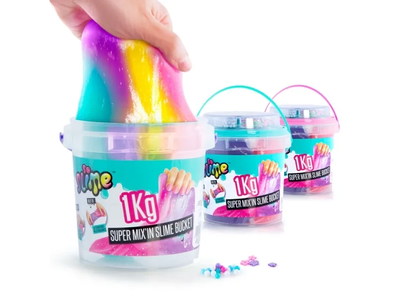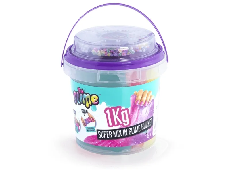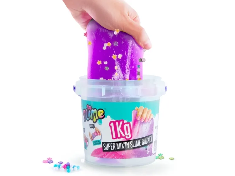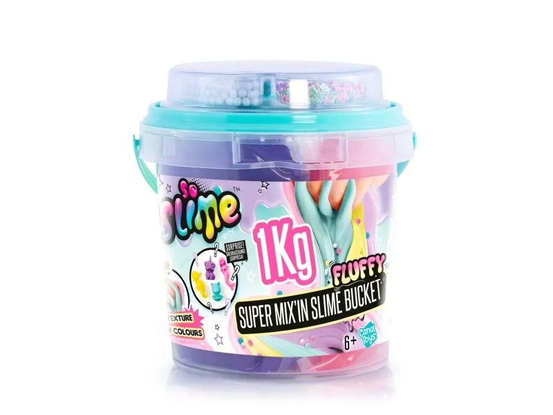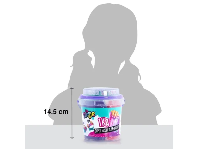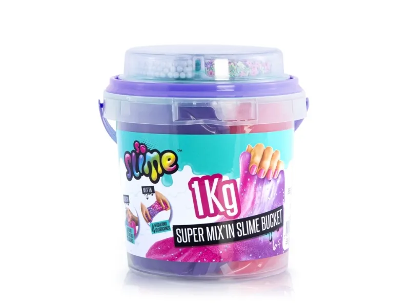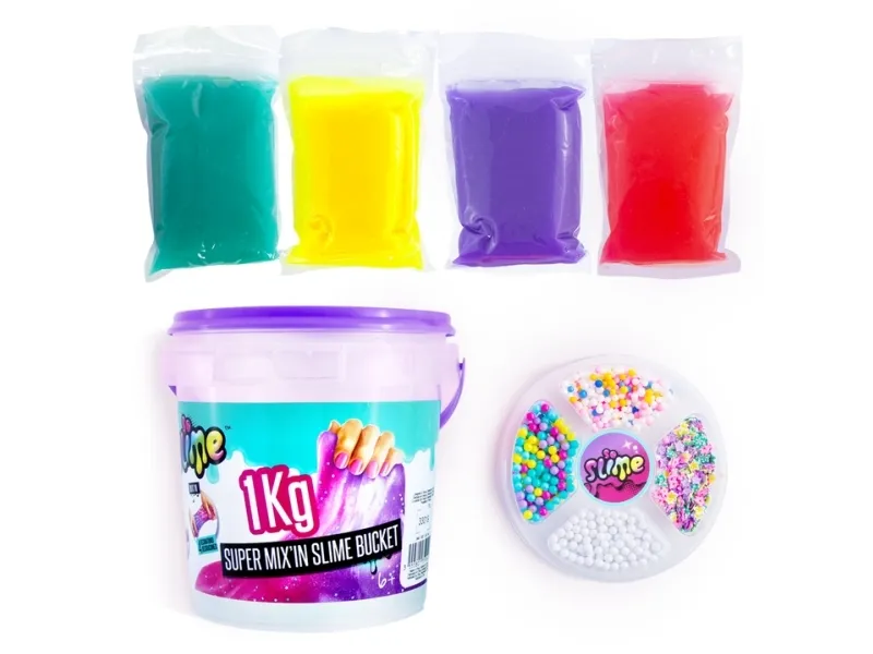 Klem på den gigantiske slimen din og legg til konfetti! Samle dem alle! Fra 6 år. Inneholder: - 1 bøtte - 4 x 250g poser med ferdiglaget slime - 4 poser med dekorasjon