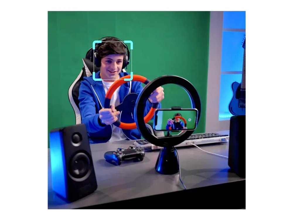 Capture content like never before with the 360 Video Maker Kit! Download the specially designed app to your smartphone and watch the 25cm LED ring light track your face as you move! Record videos to edit later or go live! Kit includes a green screen so you can add backgrounds of your choice. Plus, use the tripod for extra height and flexibility or use without as a desktop device. The perfect kit for any influencer, vlogger, budding actor, football freestyler and more!