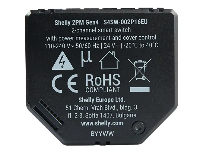 Shelly 2PM Gen4 is a sophisticated 2-channel smart relay with power measurement capabilities, supporting WiFi, Bluetooth, and Zigbee communication. Designed for installation behind switches, sockets, or lamp outlets, it enables easy control and automation of lights, fans, roller blinds, venetian blinds, awnings, and other bi-directional AC motors. Its compact design allows for easy installation in wall and ceiling boxes. Key Features. Matter Certified: Easily integrates via Matter into your favorite smart home system. Multi-protocol Chip: Gen4 devices can communicate via 2.4 GHz WiFi and/or Zigbee, with simultaneous use on different platforms. Bluetooth Functionality: Enables direct communication between Shelly relays/dimmers and battery-powered devices. Local Operation: All primary functions work 100% locally, ensuring continued operation even if your network is down. High Compatibility: Integrates with over 200 partner systems including Google Home, Apple HomeKit, Amazon Alexa, Home Assistant, Samsung SmartThings, Athom Homey, and many more. Advanced Features: Supports MQTT, HTTP, and WebSocket for advanced communication, all with TLS support. Technical Specifications. Power supply: 24V DC or 110-240V AC, Maximum load: 10A per channel, 16A total (18A peak), Two integrated power meters for separate consumption monitoring of each channel, Two optional switch inputs. Versatile Applications. Shelly 2PM Gen4 offers multiple use cases, including: Dual-channel lighting control, Socket control, Venetian blind control, including slat angle adjustment, Roller shutter, awning, and garage door control, Power Monitoring. The device automatically measures power consumption on each channel, which can be monitored through the Shelly Smart Control app and easily used for automations. Local Operation - No Gateway Required. All Shelly WiFi devices have a built-in web server, providing a host of features that always work, regardless of internet connectivity. No gateway is required, allowing you to start with just a single Shelly device.