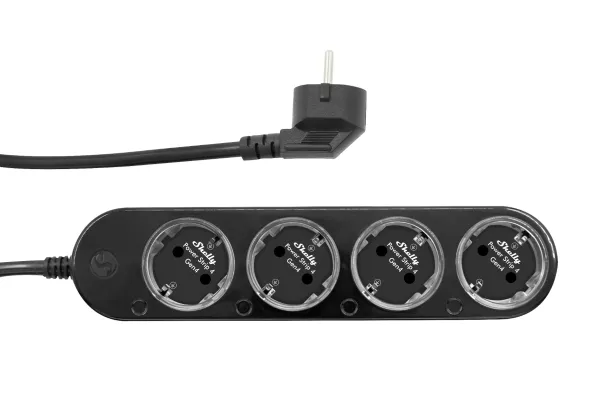 The Shelly Power Strip Gen4 is a smart power strip with four individually controlled outlets, each equipped with its own power monitoring. This allows you to track energy consumption per device and automatically switch off unnecessary standby loads. Each outlet supports up to 12A, with a total capacity of 16A, making it ideal for powering multiple devices such as PCs, TVs, chargers, and other electronics. With built-in scheduling and sunrise/sunset automation, you can manage your devices efficiently and reduce energy waste. Key Features. Four individually controllable outlets with independent energy monitoring. Load capacity: Up to 12A per outlet, 16A total. Smart scheduling: Automate device control with weekly schedules or sunrise/sunset timers. Local operation: Works 100% locally without requiring an internet connection. Energy efficiency: Automatically cut standby consumption for improved savings. The Shelly Power Strip Gen4 features Wi-Fi, Zigbee, and Bluetooth, with full Matter compatibility. It can be controlled via the Shelly Smart Control app or integrated with more than 200 smart home platforms, including: Google Home, Apple HomeKit, Amazon Alexa, Homey, SmartThings, KNX, Home Assistant, When used with the Shelly Smart Control app, the device connects via 2.4 GHz Wi-Fi. Thanks to its multi-protocol chip, you can also use Zigbee through your preferred third-party platform while simultaneously using Wi-Fi via the Shelly app.