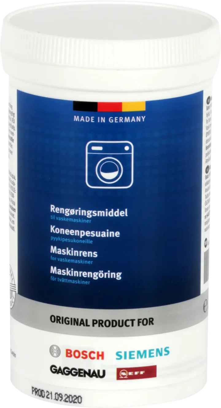 Denne maskinrensen er for rengjøring av trommelen på vaskemaskiner, rengjøringsmidlet hindrer vond lukt i å utvikle seg i vaskemaskinen din. Denne vaskemaskinrens inneholder 200 gram, som er nok til én runde eller én behandling. Dette vaskemidlet rengjør innsiden av vaskemaskinen og kan bidra til å forbedre vaskeresultatene ved å redusere flekker og merker på tøyet fra overflødig såpe. Fjerner effektivt alle avleiringer, holder slanger og pakninger elastiske, reduserer ubehagelig lukt og forbedrer levetiden til vaskemaskinen din. Så ikke nøl med å bruke Bosch Siemens Hausgeräte Maskinrens for vaskemaskiner, det ble anbefalt å bruke en maskinrens hver tredje måned.