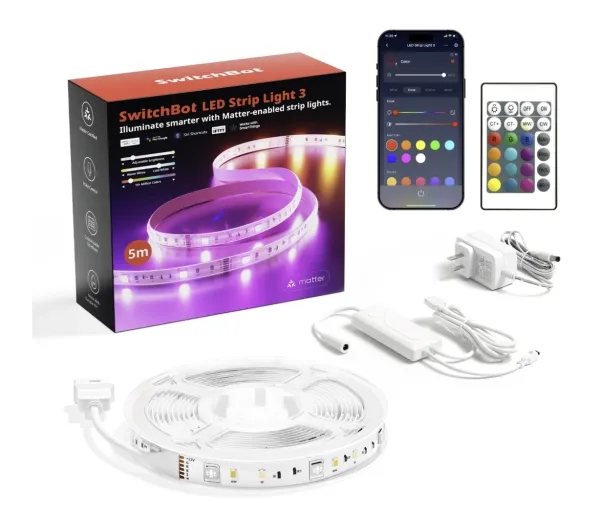 Seamless Matter & Multi-Platform Integration Certified with Matter over Wi-Fi, the SwitchBot LED Strip Light 3 works effortlessly with Apple Home, Alexa, Google Home, and SmartThings. Control your lights via voice or app, set adaptive lighting, and sync with other smart devices for automated scenes. Note A Matter-certified hub e.g., Apple TV, Google Nest is required. 3 in 1 RGBCCT Lighting Upgraded with RGB, Cold White, Warm White LEDs, offering 16 million colors and pure white tones 2700K–6500K. Enjoy vibrant party lighting or practical daily illumination with up to 1200lm brightness. No color blending each white tone shines independently for natural, accurate hues. Smart Dimming and Adaptive Lighting Enjoy smooth 1 100 brightness adjustment and full spectrum color control via the app. Instantly transform your space with preset modes for movie nights, immersive gaming, cozy reading, or sleep-friendly warm dimming. Voice, Music and Total Customization Freedom: Enjoy hands-free control with voice commands like Alexa, turn on sunset mode. Let the built-in microphone sync lights to your music’s beats for lively parties, or set an ambient mood for relaxation. Plus, create automated schedules via the app for ultimate convenience. Smart Home Ecosystem Ready Connect with SwitchBot sensors and devices for advanced automation lights gently brighten when motion is detected at night, flash red and trigger camera alarms if intruders approach, and welcome you home with auto-lit scenes when unlocking the Lock Ultra. Durable and Effortless Installation IP44 waterproof with a 25,000 hour lifespan, designed for long-term use, bending, and twisting. The cut to fit design allows for trimming every 8cm on the 5m strip, with industrial-strength 3M adhesive perfect for TVs, desks, or cabinets. Control easily via the included remote switch, no app needed, making it senior and kid-friendly.