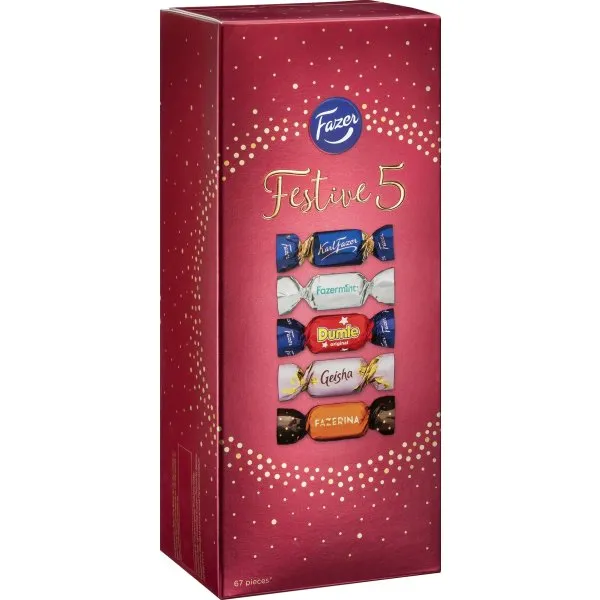 Festive 5 fra Fazer er en festlig og velsmagende blanding af 5 chokoladefavoritter, i en flot og en stilfuld lille gaveæske.