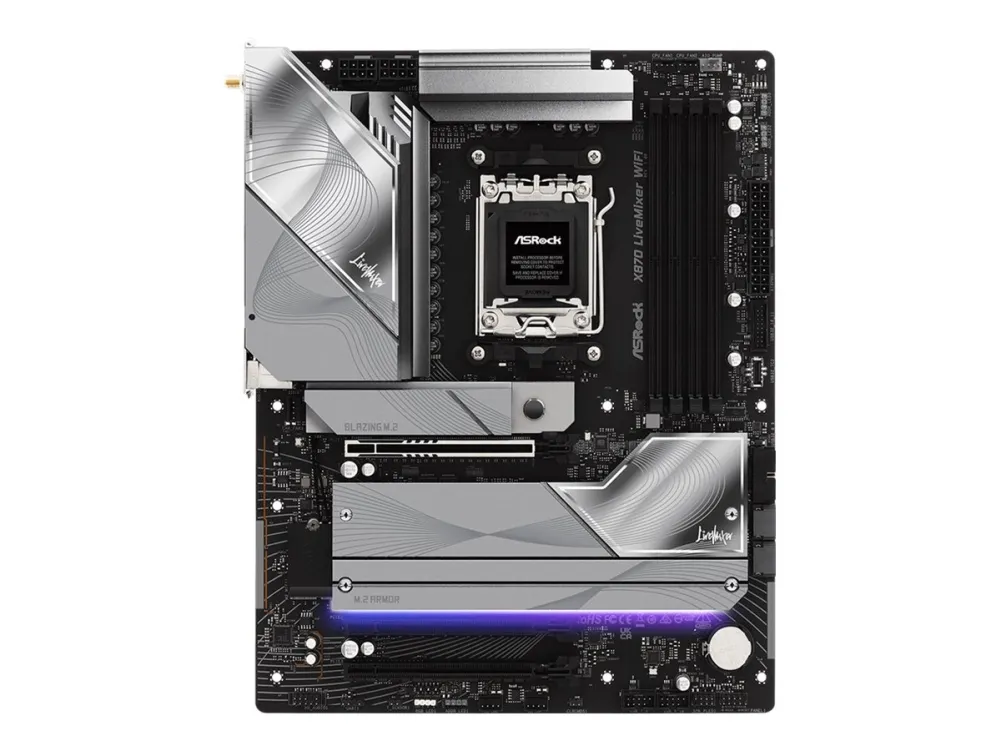 The ASRock X870 LIVEMIXER WIFI motherboard delivers a platform for building a high-performance system. Featuring support for the AMD Ryzen 7000/8000/9000 Series processors and equipped with a Socket AM5, this motherboard is designed for gamers and content creators seeking efficiency and versatility. The 4 DIMM slots enable dual-channel memory architecture, accommodating DDR5 SDRAM with speeds up to 8000 MT/s (O.C.). Enhanced with high-definition audio technology and a Realtek ALC4082 codec, it ensures immersive sound quality for both gaming and multimedia applications. Connectivity is abundant with multiple USB ports including USB 4, USB-C, and traditional USB connections, making it easy to connect peripherals and external devices. Equipped with Wi-Fi 6 and Bluetooth 5.4 capabilities, this motherboard ensures fast and reliable networking options. The board's design features a DIY-friendly layout and includes essential hardware improvements like a pre-mounted I/O shield and an enlarged heatsink armor for optimal thermal performance. For users who demand versatility, the ASRock X870 LIVEMIXER WIFI provides multiple expansion slots for graphics and storage options including Blazing M.2 and Hyper M.2 sockets. This combination of features and technology makes it a choice for building a future-ready PC.