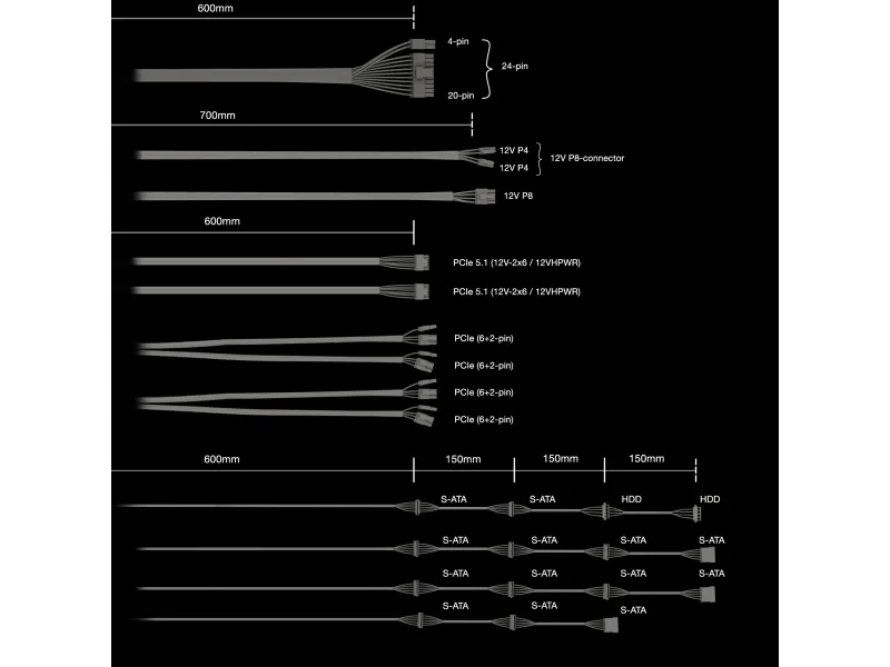 be quiet! Dark Power 14 1200 W - 80 Plus Titanium. Total power: 1200 W, AC input voltage: 100 - 240 V, Peak power: 1300 W. Motherboard power connector: 20+4 pin ATX, Motherboard power cable length: 60 cm, SATA power cable length: 600,750,900,1050 mm. Purpose: PC, Power supply unit (PSU) form factor: ATX, 80 PLUS certification: 80 PLUS Titanium. Product colour: Black, Cooling type: Active, Fan diameter: 13.5 cm. Compliance certificates: CB, Federal Communications Commission (FCC), RoHS, TÜV mark, UKCA, WEEE, cTUVus