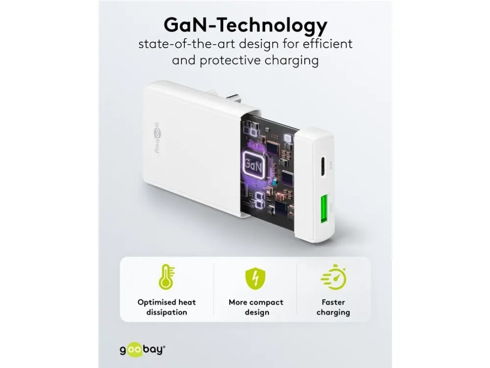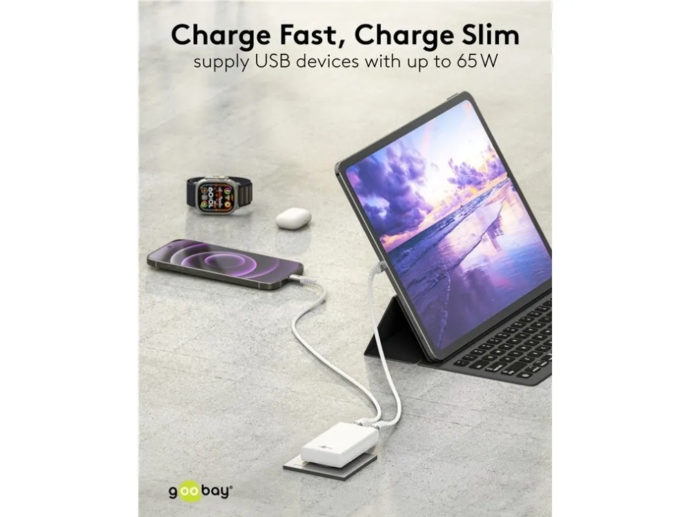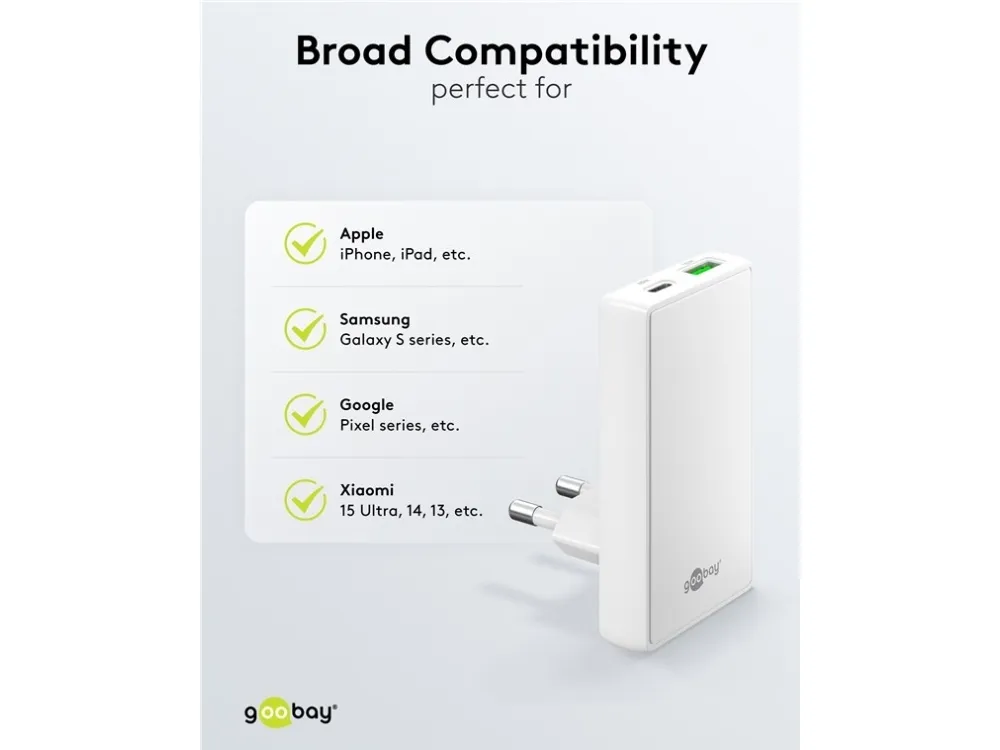 1x USB-C™-port (Power Delivery) og 1x USB-A-port (Quick Charge) Farveversion Når USB-C™-opladeren er tilsluttet stikkontakten, er den knap så dyb som en fodliste og dermed ekstremt pladsbesparende – ideel i trange rum, f.eks. bag natborde og andre møbler Med den stærke effekt på 65 W og den universelle USB-C™-port kan opladeren forsyne stort set alle enheder, fra smartphones til højtydende bærbare computere GaN-teknologiske halvledere muliggør hurtigere og mere effektiv opladning og et lettere og mere kompakt design sammenlignet med traditionelle opladere Med Power Delivery har USB-laderen en særlig sikker og dynamisk opladningsmetode, der bestemmer den optimale udgangseffekt for den tilsluttede enhed Med to forskellige USB-porte er den rigtige port altid lige ved hånden – så du kan rejse komfortabelt med kun én oplader i bagagen USB-adapteren er kompatibel med smartphones som Apple iPhone, Samsung, Xiaomi, LG, Huawei samt tablets som Apple iPad eller Samsung Galaxy USB-C™-opladerens integrerede beskyttelseselektronik beskytter tilsluttede enheder mod overstrøm, overopladning og overophedning
