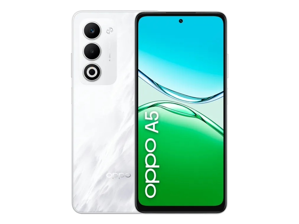 OPPO A5 . Display diagonal: 16.9 cm (6.67"), Display resolution: 1604 x 720 pixels. Processor frequency: 2.1 GHz, Processor family: Qualcomm Snapdragon, Processor model: 6s Gen 1. RAM capacity: 6 GB, RAM type: LPDDR4X, Internal storage capacity: 128 GB. Rear camera resolution (numeric): 50 MP, Rear camera type: Dual camera. SIM card capability: Dual SIM. Operating system installed: Android 15. Battery capacity: 6000 mAh. Product colour: White. Weight: 194 g