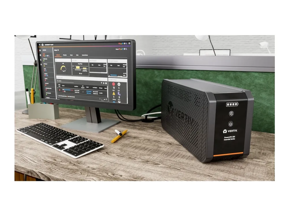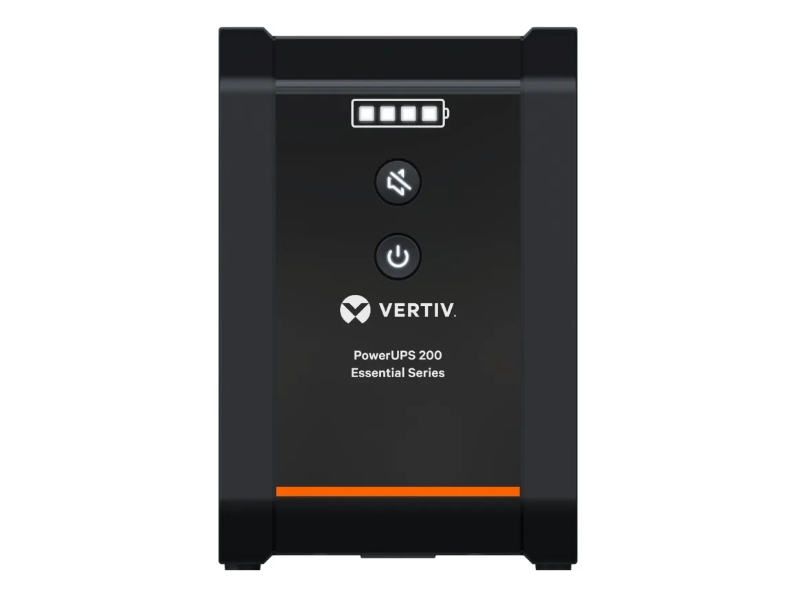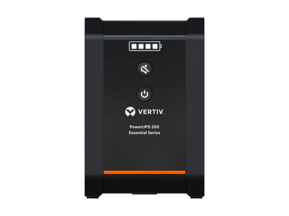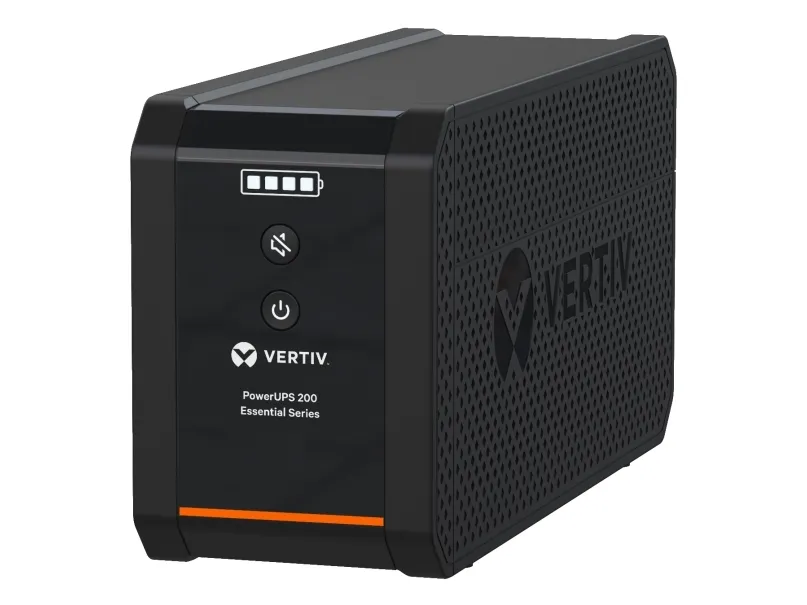 The Vertiv Essential Series UPS delivers reliable power protection for critical devices and equipment. With a power capacity of 1000 VA and an efficiency rating of 95%, this UPS ensures optimal performance while safeguarding against surges and voltage fluctuations. The line interactive technology enhances its ability to adapt to changing power conditions, providing a sinewave output for sensitive electronics. Designed with versatility in mind, it includes multiple output connectors to facilitate connections to various devices, making it suitable for both home and office use. With a compact external form factor and an operational temperature range from 0°C to 40°C, this UPS can be positioned conveniently in different environments while maintaining a low sound emission level of 45 dBA, ensuring quiet operation.