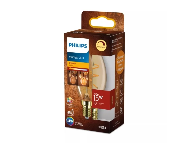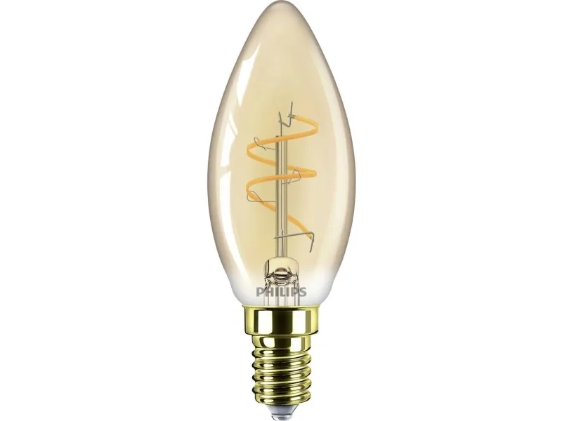Philips Vintage Gold spiral B35 Bulb, kan dæmpes, uden flimmer, EyeComfort, 180 lumen, ekstra varmt hvidt lys (1800 K), 2,7 W = 15 W, E14 sokkel, 1-stk. pakke.