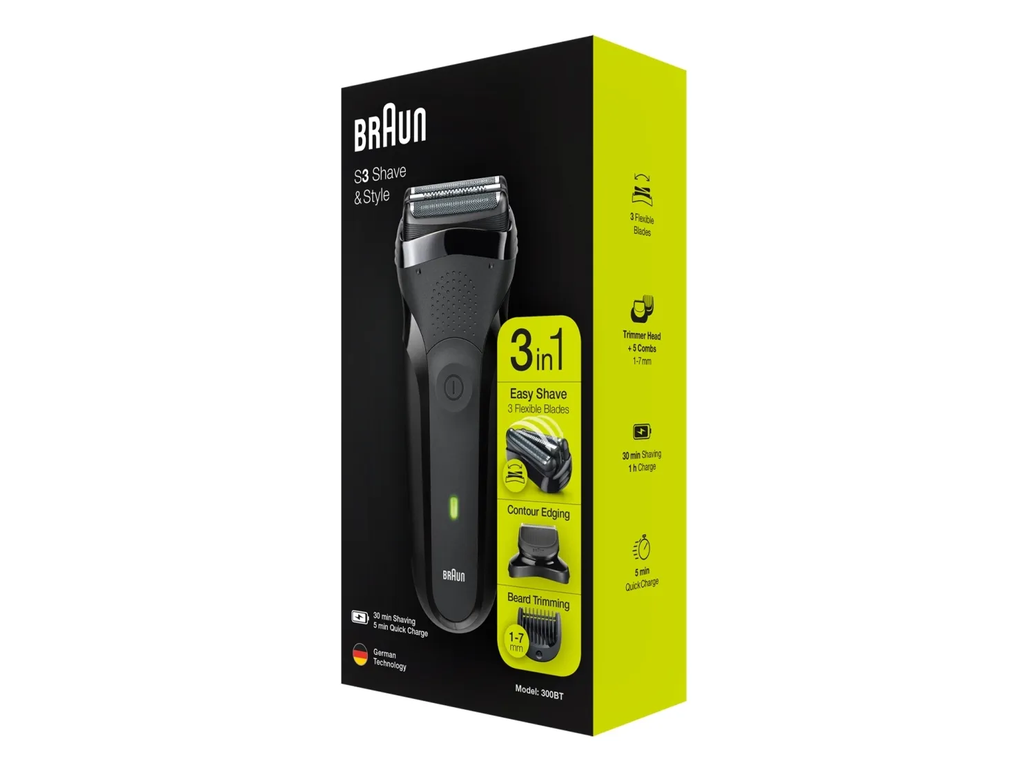 Ergonomic grip for intuitive use. It all adds up to an effortless shaving and trimming experience.Braun Series 3 300BT. Shaver system: Rotation shaver, Product colour: Black, Control type: Buttons. Power source: Battery, Battery technology: Nickel-Metal Hydride (NiMH), Battery type: Built-in battery. Package type: Box. Attachment combs: Beard, Head