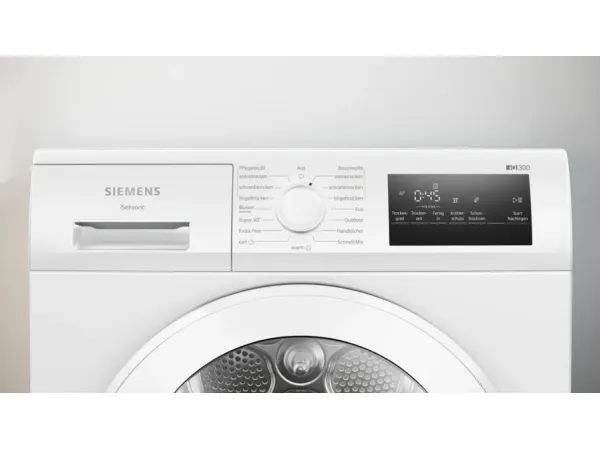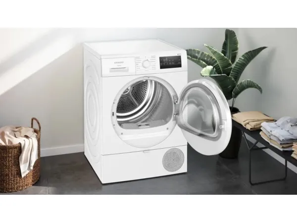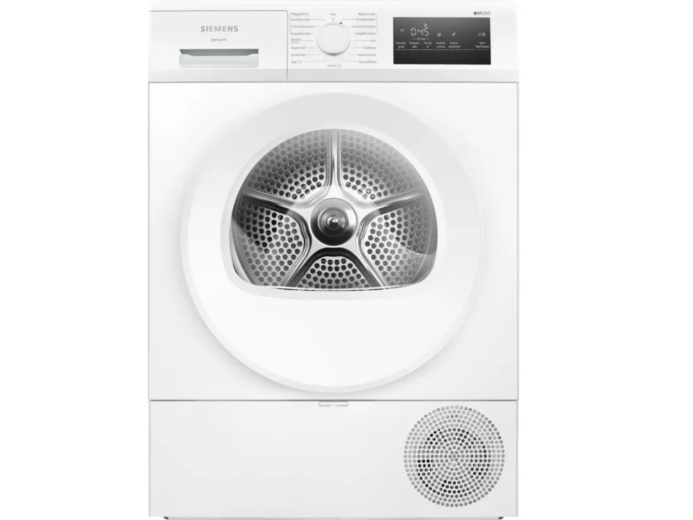 Siemens iQ300 WT45HVA4. Appliance placement: Freestanding, Loading type: Front-load, Drying system: Condensation. Rated capacity: 8 kg, Condensation efficiency class: C, Drying programs: 40min, Blouse/shirt, Cotton, Delicate/silk, Easy care, Mix, Outdoor/sport, Quick, Timed, Towel. Delay start (max): 24 h. Energy efficiency class: D, Energy consumption per 100 cycles: 119 kWh, Energy consumption: 1.19 kWh. Depth: 613 mm, Width: 598 mm, Height: 842 mm