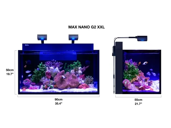 MAX NANO G2 XXL är ett proffs-storlek korallrev med alla NANO-fördelar, inklusive Plug & Play-installation, REEF-SPEC belysning, överlägsna cirkulations- och filtreringssystem, ReefATO+ och NanoMat-kompatibla bakre sumpkammare.