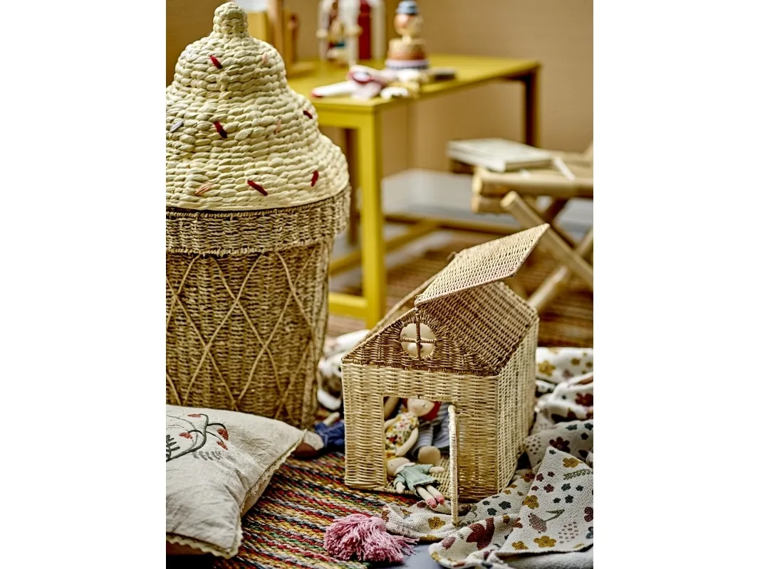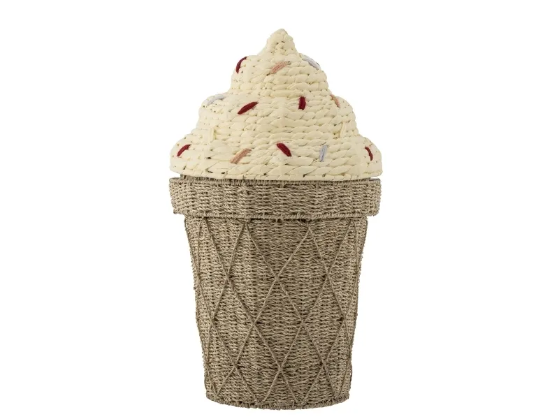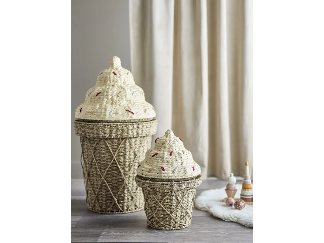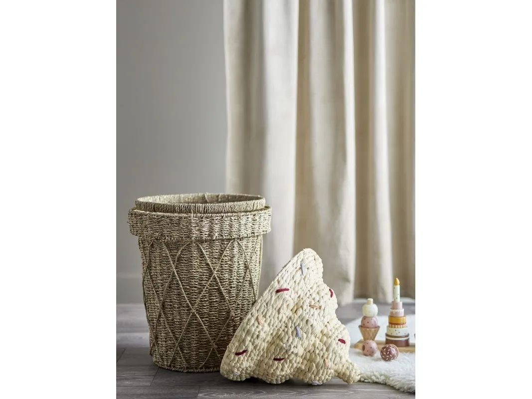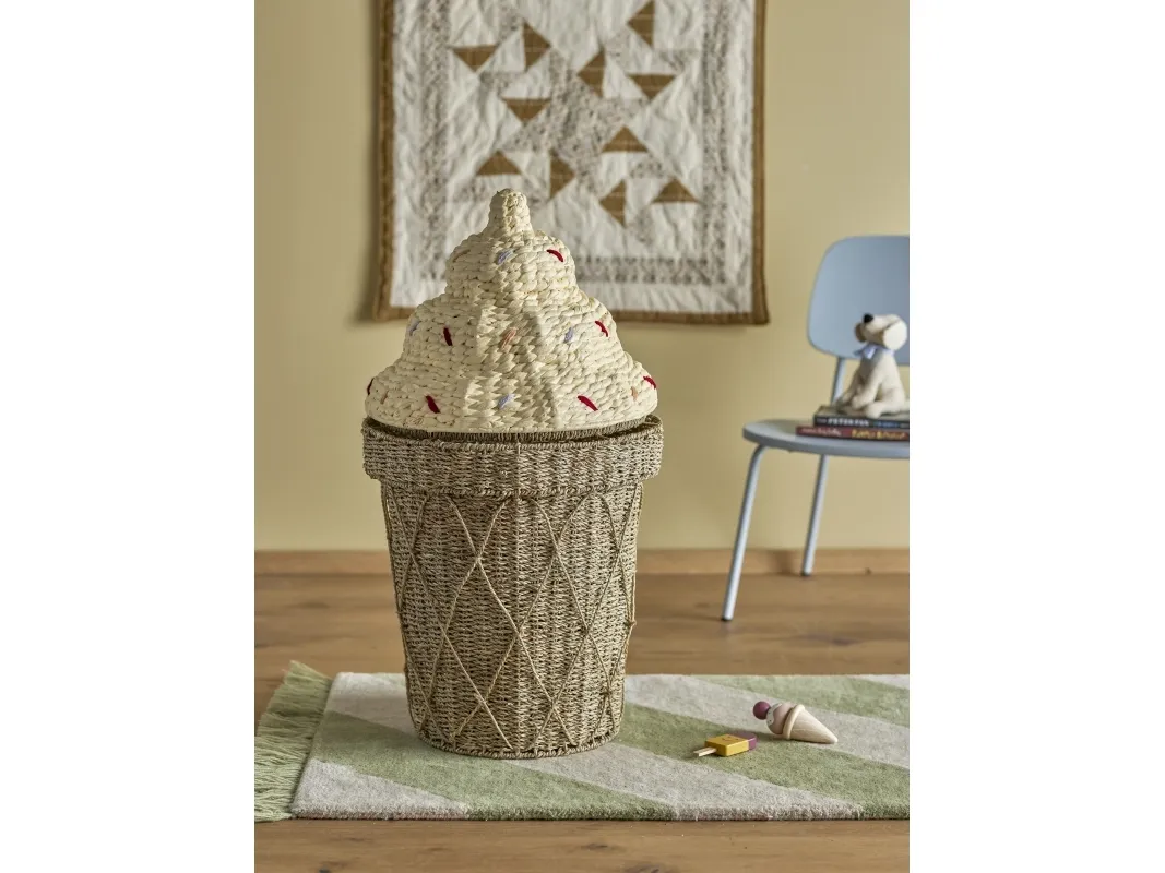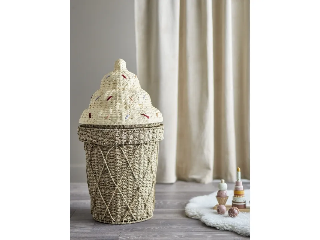 Cillie Kurv m/låg fra Bloomingville MINI forestiller en sød vaffelis med krymmel på toppen. Denne sjove og praktiske kurv har god plads til opbevaring af alle barnets yndlingsting, og giver børneværelset et legende og dekorativt touch. Den is-formede kurv har et låg som let kan tages af, så det er let for de små hænder at få fat i bamser og legetøj, samt at gemme det væk igen.