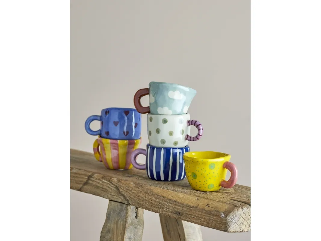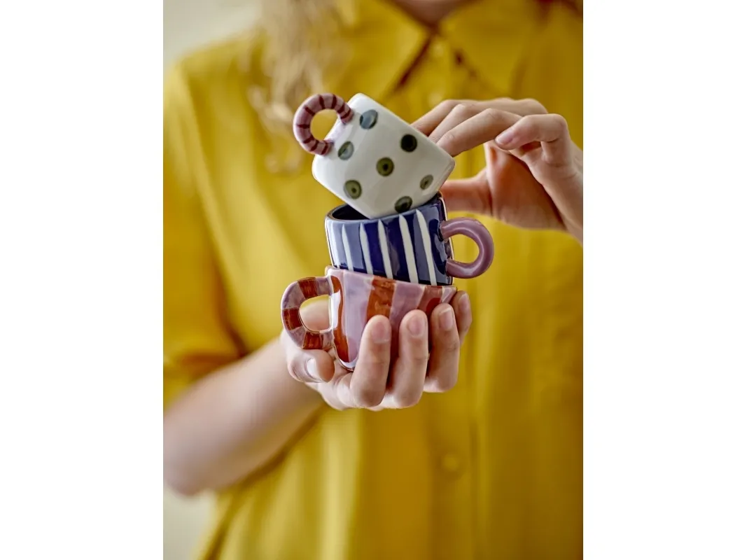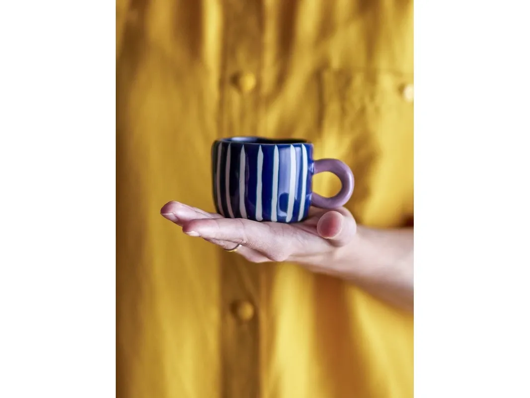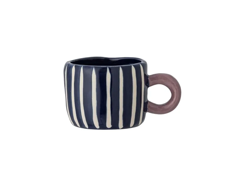 Nini Koppen fra Bloomingville er fremstillet af stentøj og har et sødt, håndmalet mønster. Koppen er dekoreret med fine blå og hvide striber, med et håndtag i en dyb rosa. Koppens unikke design gør den velegnet til at kombinere med andre kopper, for at skabe en sjov og dekorativ samling. Den charmerende kop er ideelt til at pynte i køkkenet på en kopreol, når den ikke er i brug. De håndmalede detaljer gør hver kop unik.