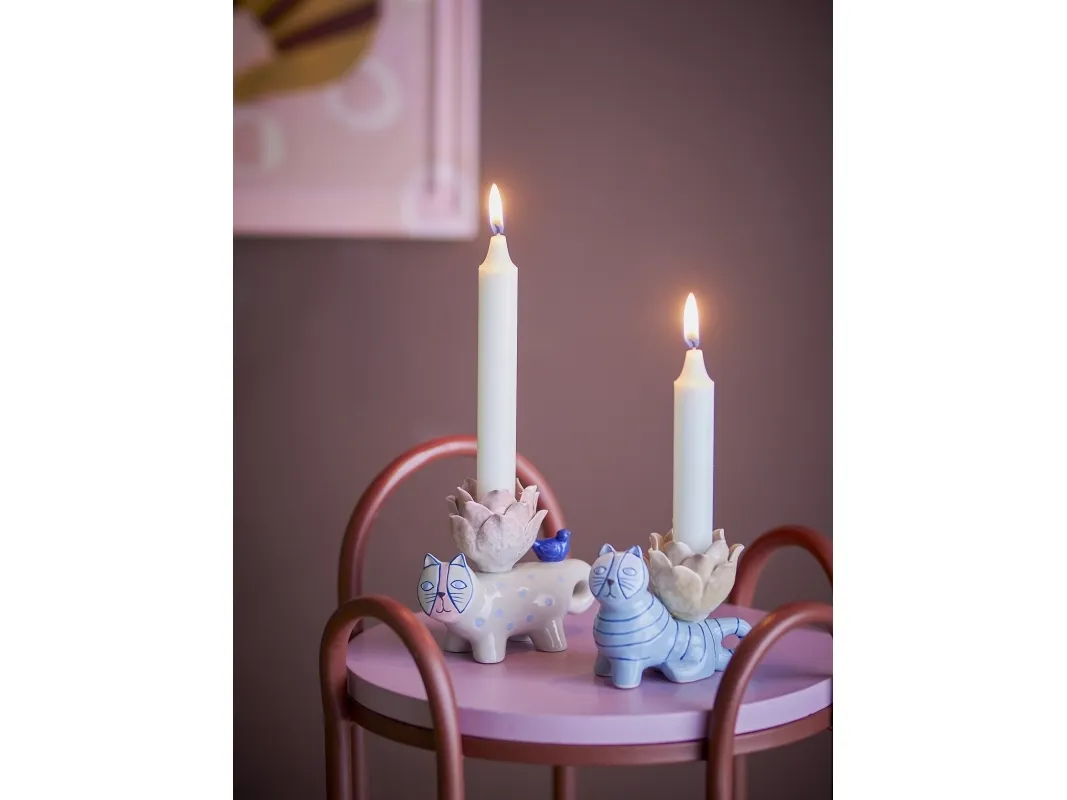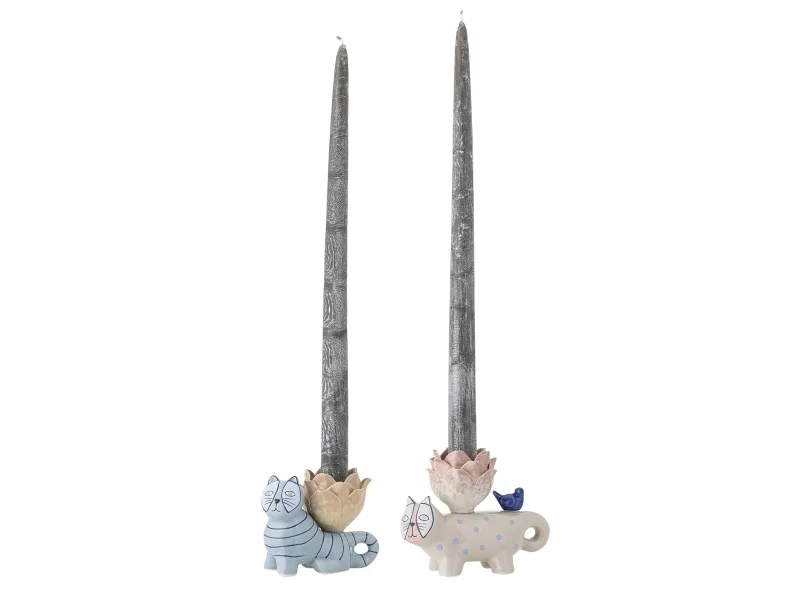 Missy Lysestagen fra Bloomingville kommer som et sæt af to og forestiller katte med blomsterformede holdere til stearinlys på ryggen. De er lavet af stentøj og dekoreret i håndmalede pastelfarver. Små variationer kan forekomme og gør hvert sæt unikt.