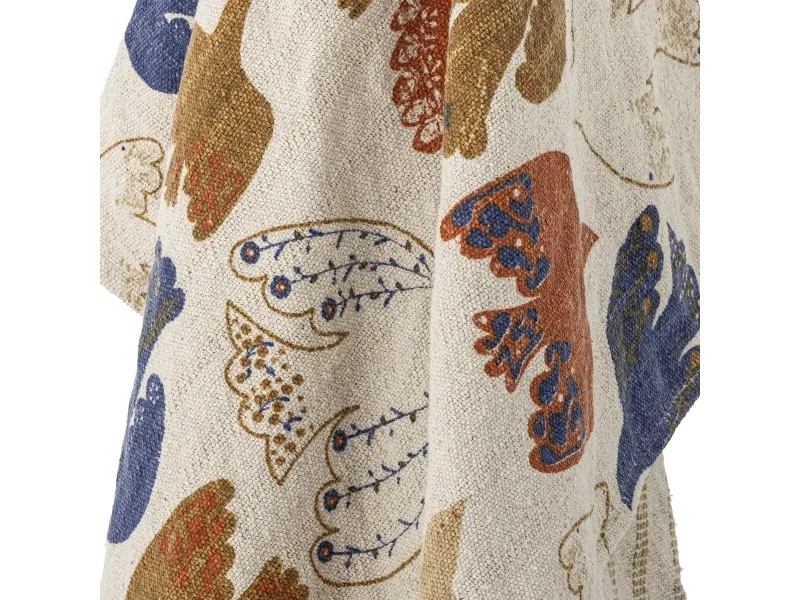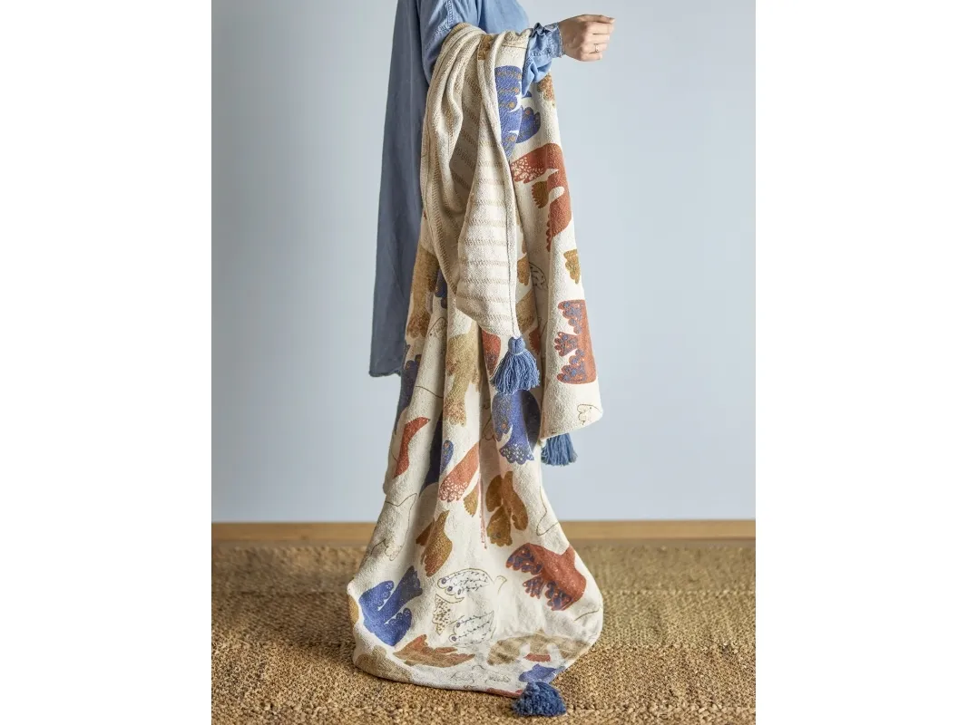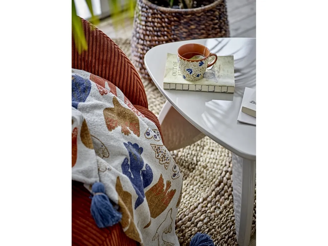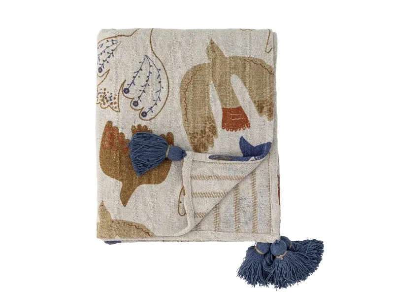 Anniversary Plaiden fra Bloomingville er vævet i genanvendt bomuld og har et grafisk print i varme, farverige nuancer. De blå kvaster i hjørnerne tilføjer en legende kontrast og fuldender det dekorative udtryk.