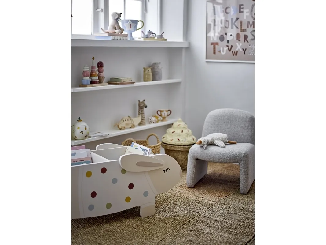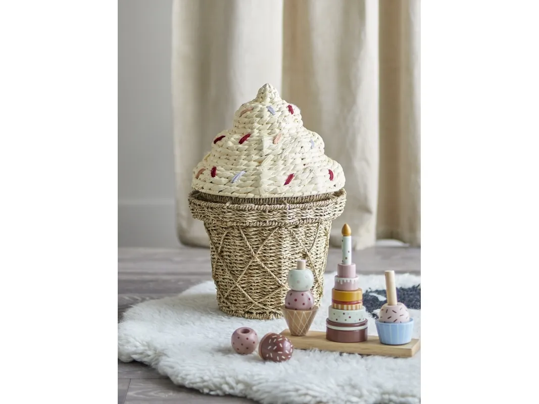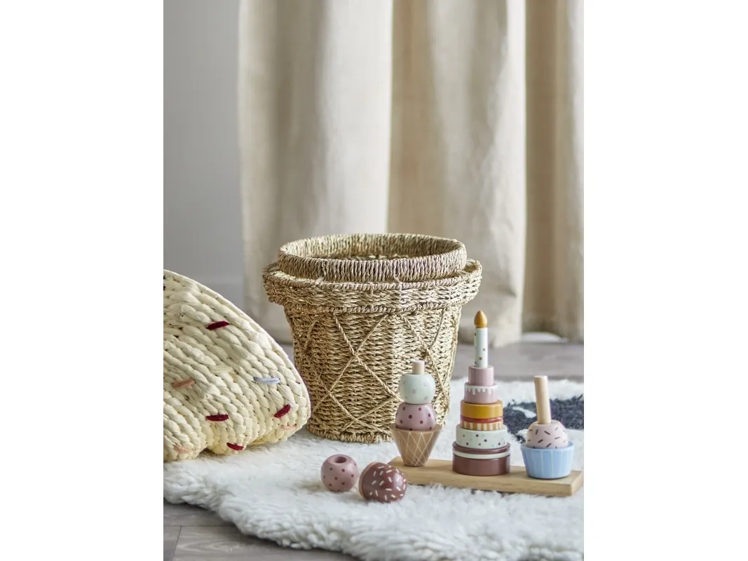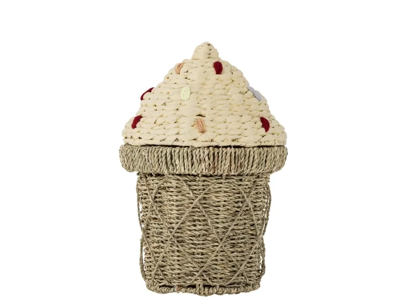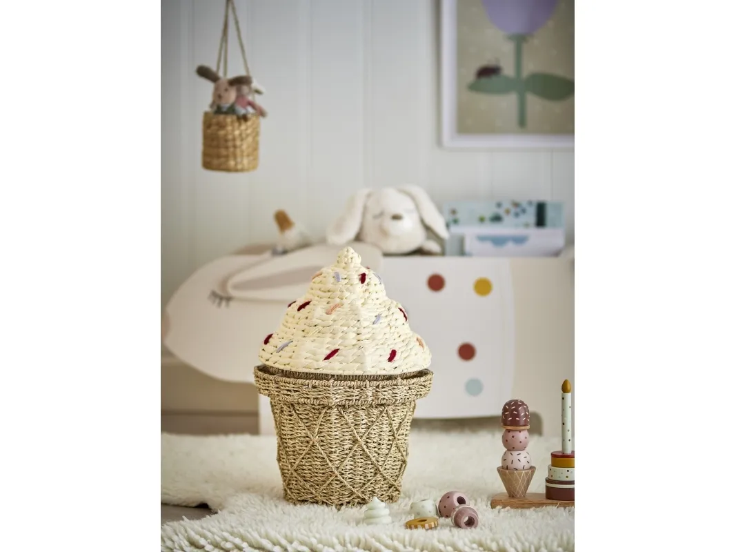 Cllie Kurven med låg fra Bloomingville MINI er flettet i søgræs og formet som en isvaffel. Et legende opbevaringselement, der bringer glæde og fantasi ind i børneværelset.
