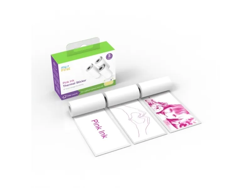 Turn every snap into a keepsake with these vibrant thermal stickers made just for your little creator. Designed to pair perfectly with myFirst instant print cameras they deliver sharp durable prints in a fun pink-on-white finish for scrapbooks journals gifts and more. Compatible with myFirst Camera Insta 2 and Insta Wi Sharp dark image quality 10-year image durability Smooth paper surface for clean application Free end roll design for easy use Compatible with myFirst Camera Insta 2 and Insta Wi Engineered to work seamlessly with myFirst Camera Insta 2 and Insta Wi these thermal stickers drop in and print flawlessly. No extra setup or software is needed so kids can start creating and decorating right away. Sharp dark image quality Enjoy crisp lines and clear details that make every sticker stand out. The thermal coating is optimized for consistent high-contrast results ensuring your characters doodles and captions look bold and readable. 10-year image durability Create with confidence knowing your memories will last. The prints are formulated to resist fading for up to 10 years so journals crafts and keepsakes stay bright and legible over time. Smooth paper surface for clean application The ultra-smooth surface makes every sticker easy to apply without bubbles or rough edges. It adheres neatly to notebooks water bottles scrapbooks and more for a polished professional look. Free end roll design for easy use A free end roll makes starting and peeling effortless so kids can print peel and stick without frustration. Less fiddling means more time to create. Package includes 3x rolls (3 m per roll) Product specifications Compatible models: myFirst Camera Insta 2 myFirst Camera Insta Wi Sticker color and print: white stickers with pink ink Image density: sharp and dark Image durability: up to 10 years Sticker size: 57 mm x 26 mm Roll length: 3 m per roll Surface: smooth paper surface Roll type: free end roll