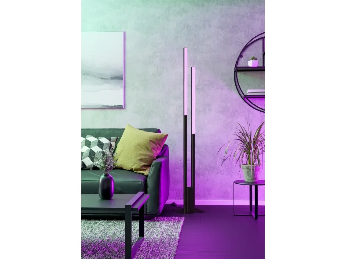 EGLO CONNECT-Z FRAIOLI-Z gulvlampe i sort. Højde 175,5 cm, bredde 28 cm. LED, 2 x 17 watt, 4800 lumen, 2700-6500 kelvin, RGB + Tunable white. Lampen kan dæmpes og styres med fjernbetjening (medfølger ikke), via AwoX Home Control app (gratis), eller ved stemmestyring. Zigbee er kompatibel med Amazon Alexa og Google Assistent. IP20. Dette produkt indeholder lyskilder med energieffektivitetsklasse: E.