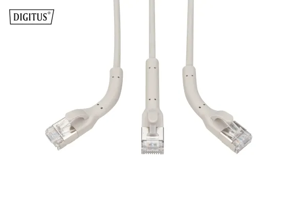 The DIGITUS® bendable slim patch cables are characterized by their small outer diameter and a highly flexible, bendable grommet. The bendable and slim design enables versatile use and effortless installation - even in confined areas or around corners. In addition, the DIGITUS® bendable slim patch cables are manufactured in accordance with the ISO/IEC 11801 and DIN EN 50173 CAT 6A standards. They ensure that the cable installation complies with ISO and EN channel specifications and offer excellent performance in the DIGITUS® CAT 6A cabling system. Performance has been tested up to 500 MHz, including features such as near-end crosstalk ("NEXT"). DIGITUS® patch cables have been specially developed to meet all requirements in various applications. Each cable is equipped with a molded, bendable kink protection with strain relief. In addition, the grommet has a locking lever protection that prevents the cable from kinking and the locking lever from breaking off at the plug.Digitus CAT 6A F-FTP bendable patch cable, copper, 1.5 m, gray. Cable length: 1.5 m, Cable standard: Cat6a, Cable shielding: F/FTP (FFTP), Connector 1: RJ-45, Connector 2: RJ-45, Product colour: Grey