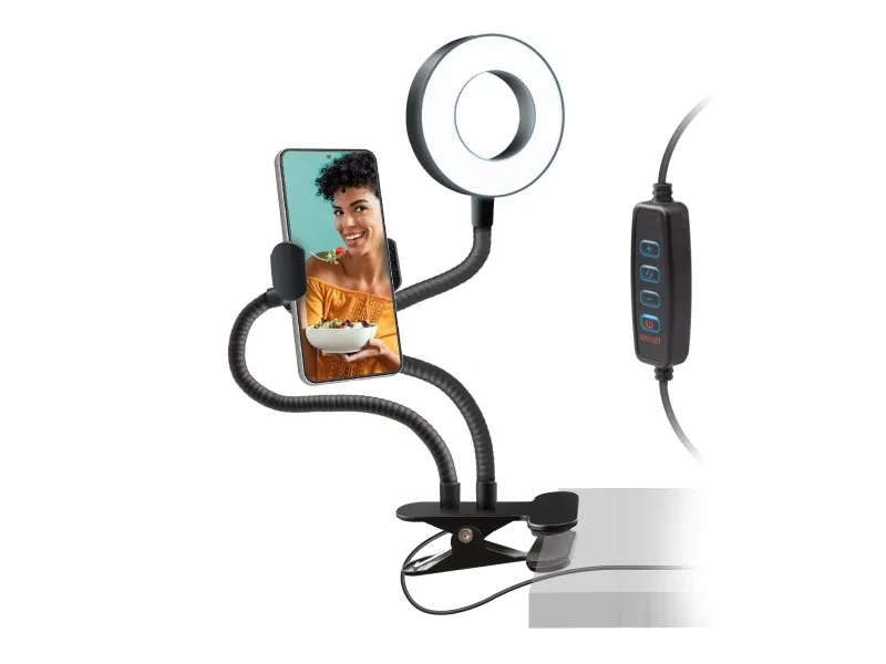 To create professional photos and videos, you need adjustable lighting suitable for the surroundings. For this reason, the swivel LED ring is a must-have accessory for your selfies, video tutorials or live-streaming on your favourite social networks like Instagram, Facebook, YouTube, TikTok. The 9 cm diameter LED ring offers 10 levels of brightness, is adjustable and has 3 light options (warm, cold and natural): unleash your creativity. The adjustable clamps have an opening of up to 8.5 cm, making it suitable for most smartphones of Apple, Samsung, Xiaomi, Huawei, Oppo and many other brands.