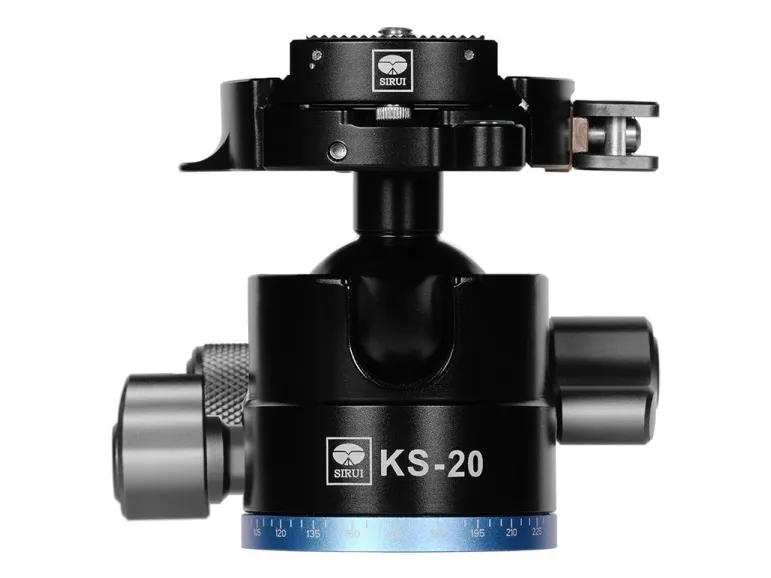 Notch on KS-5, KS-10 and KS-20 supports vertical shooting.Sirui Kugelkopf KS-20. Product type: Ball head, Product colour: Black, Material: Aluminium. Height: 77 mm, Weight: 320 g. Number of products included: 1 pc(s)