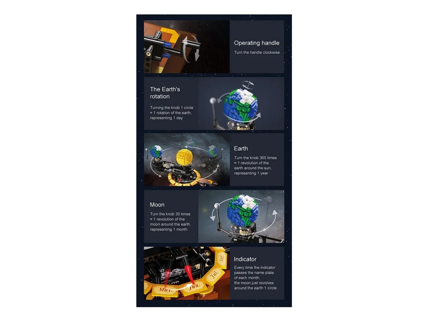 CaDA Solar System Bricks by JAMARA – A Building Set with 865 Pieces for All Astronomy Enthusiasts! Welcome to the world of CaDA Bricks – a brand renowned for its quality, precision, and endless building fun! JAMARA offers this premium building set that will captivate both beginners and experienced builders. Thanks to perfect precision and robust craftsmanship, these bricks allow you to create highly detailed models, impressive architectural works, or unique custom creations. The CaDA Solar System Bricks is a fascinating model that brings the wonder of our solar system directly into your home. With 865 pieces, you can recreate the entire system of the Sun, Earth, and Moon in intricate detail. The model is distinguished by its thoughtful engineering, which not only mimics the appearance of celestial bodies but also their movements in a realistic manner. A mechanical rotation mechanism allows the Sun, Earth, and Moon to rotate in a unique way, simulating the Moon's orbit around the Earth and the phases of the Moon in a truly striking way. This model promotes an understanding of astronomical relationships by visually illustrating the lunar phases and the months. With the easy-to-understand instructions, both young and adult model-building fans can create the Solar System in all its glory while developing fine motor skills and technical understanding. The Solar System is a must-have for all those fascinated by astronomy and the wonders of the universe. Brick by brick – a truly unique building experience!Jamara CaDA Solar System Bricks. Product type: Building set, Recommended age (min): 8 yr(s), Number of pieces: 865 pc(s). Package weight: 1.49 kg