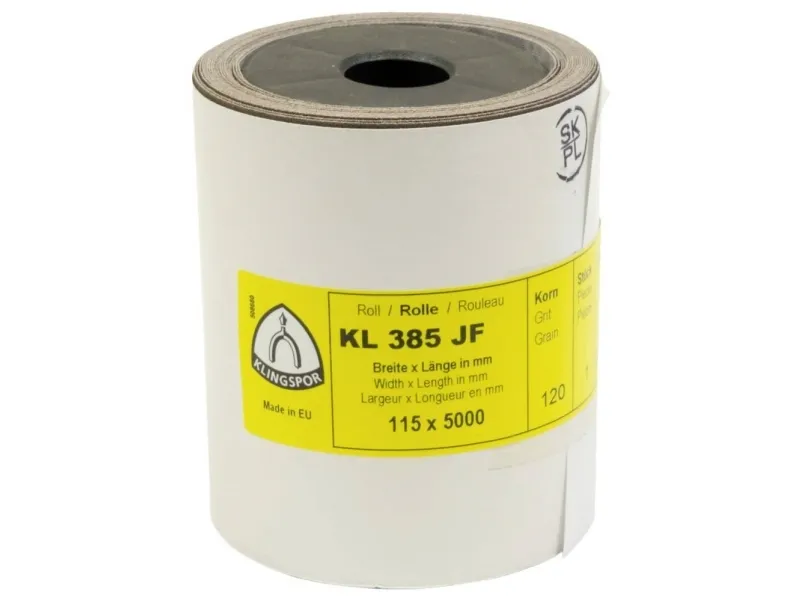 KL 385 VF sliberulle, 115 x 5000 mm korn 60 Med sliberullerne KL 385 VF leverer Kingspor et universelt anvendeligt kvalitetsprodukt med et fremragende pris-/ydelsesforhold. Takket være det ekstremt fleksible stofunderlag egner sliberullerne sig særdeles godt til profilslibning af metal, NE-metal, rustfrit stål og træ.
