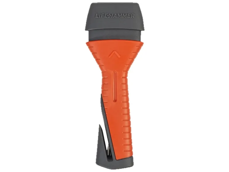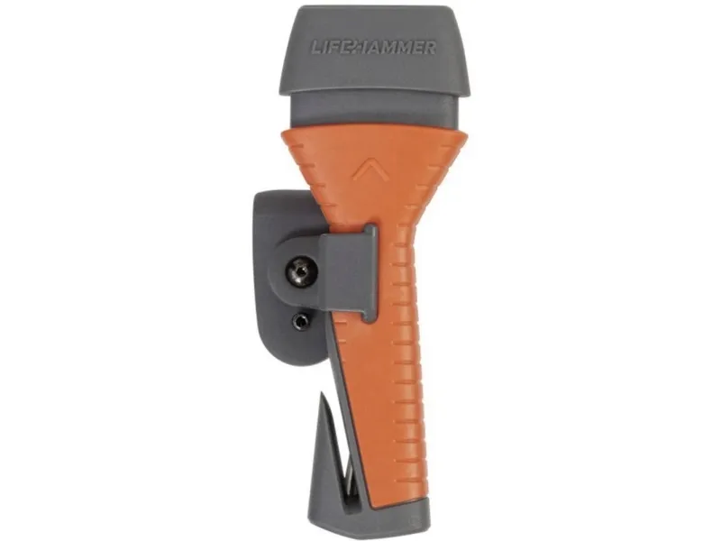 Nødhammer Evolution med selekniv Denne automatiske sikkerhedshammer kan let og sikkert anvendes af voksne og børn. Når hovedet i denne sikkerhedshammer trykkes ned til køretøjets sidekskrige, springer det ultrahårde keramiske hammerhoved ud, slår skiven i stykker og er derefter klar til brug igen med det samme. Med den integrerede kniv af sædet kan du uden besvær skære alle sikkerhedssele ud. Takket være QUICK CLICK-SYSTEMET kan din sikkerhedshammer monteres i løbet af få sekunder i en vilkårlig position. På den anden side af QUICK CLICK-SYSTEMET kan der fastgøres et andet LIFEHAMMER-produkt.