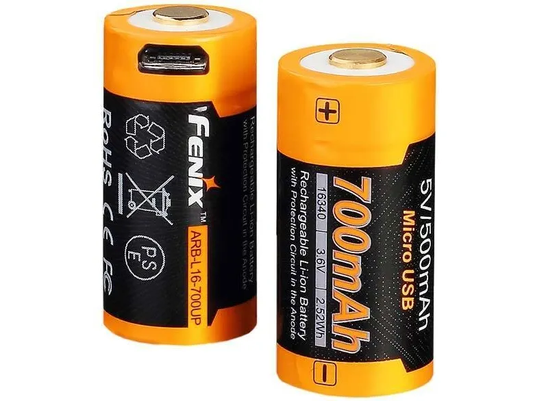 Fenix ARB-L16UP-700. Battery type: Rechargeable battery, Battery technology: Lithium-Ion (Li-Ion), Battery voltage: 3.6 V. Height: 35.5 mm, Diameter: 1.68 cm, Weight: 18.8 g