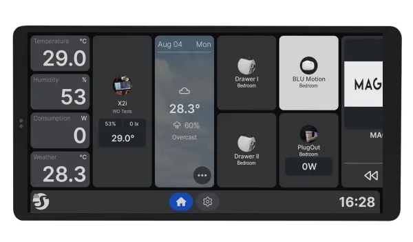 The Shelly Wall Display X2i is an advanced 6.9 touchscreen designed for professional control of smart home and building installations. It provides direct control of lighting, heating, shading, and Sonos/Bluetooth speakers. As the successor to the Wall Display X2, it is available with a silver (aluminium) or black frame. The unit fits a standard European wall box (horizontal or vertical) and requires only 230 V, but it can also be powered via USB-C when surface-mounted. The X2i includes an interchangeable base with a built-in 5 A relay for controlling lighting or underfloor heating. Optional bases with a dual relay or dimmer module are available. Once connected to Wi-Fi, the device provides full access to all Shelly devices and can display a Home Assistant dashboard for third-party integrations. The X2i features a built-in thermostat function and can control underfloor heating using an external temperature sensor. Key features: 6.9 touchscreen with intuitive interface, Fits standard EU wall boxes; 230 V or USB-C power supply, 2.4 GHz Wi-Fi, Interchangeable base with 5 A relay (optional dual relay or dimmer), Integrated light sensor, Built-in thermostat function (requires external temperature sensor), Real-time energy monitoring, Control of Bluetooth and Sonos speakers, 0.8 W speaker for radio and alarms, Bluetooth gateway for Shelly BLU devices