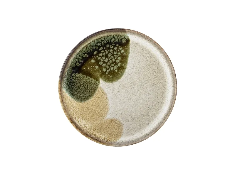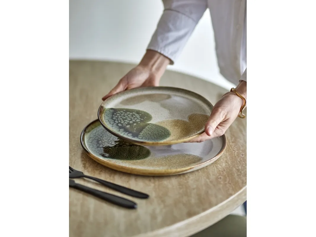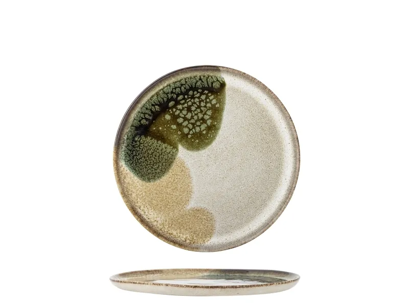 Jules Tallerkenen fra Bloomingville er fremstillet i stentøj med en reaktiv glasur og håndmalet overflade. Den har en spættet beige bund med flydende strøg i dyb grøn og brun, der danner bladlignende motiver. Små variationer i mønster og farvestyrke kan forekomme, så hver tallerken er unik.