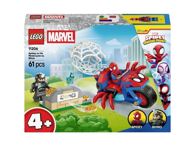 La barn oppleve actionfylt superheltlek med byggeleken Spidey på motorsykkel mot Rhino (11206) for jenter og gutter fra fire år. Dette Spidey-byggesettet med minifigurer av Spidey og Rhino og en edderkoppformet motorsykkel styrker barns kreativitet gjennom gøyal lek. Barn kan hjelpe Spidey med å få tilbake en stjålet, blå edelsten, unngå pizzaer som skytes ut fra Rhinos pizzaovn-skyter og fange Rhino i en diger edderkoppnett-felle – som kan festes på motorsykkelen. Byggesettet er laget for nye byggere og er stappfullt av detaljer som inspirerer barn til å finne på grenseløs, fantasifull lek. Settet er en flott bursdags- eller overraskelsesgave til fans av Spidey og hans fantastiske venner. Det inkluderer fargerike, bildebaserte instruksjoner, store startklosser og poser med én byggbar modell per pose, slik at byggeprosessen blir gøyal og enkel. Med LEGO Builder appen kan barn zoome, rotere sett i 3D og spore framdriften sin med barnevennlige digitale instruksjoner. Settet består av 61 deler.