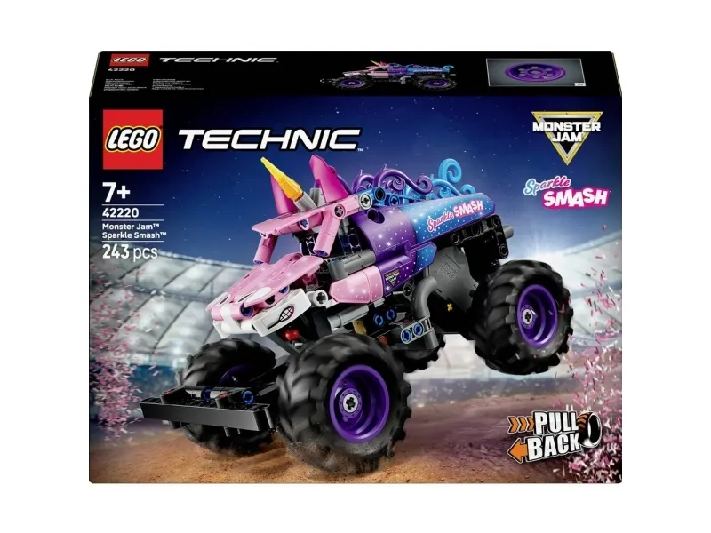 MONSTER JAM™-BYGGELEKE – LEGO® Technic Monster Jam™ Sparkle Smash™ pullback (42220) byr på timevis med lek for jenter, gutter og barn fra sju år, som liker monstertrucker og enhjørningleker