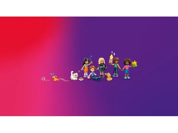 FEM LEGO® FRIENDS FIGURER – denne rollelekeleken for barn inkluderer fem minidukker – Autumn, Nova, Aliya, Leo og Liann samt katten Churro, kaninen Honey og gekkoen Popcorn