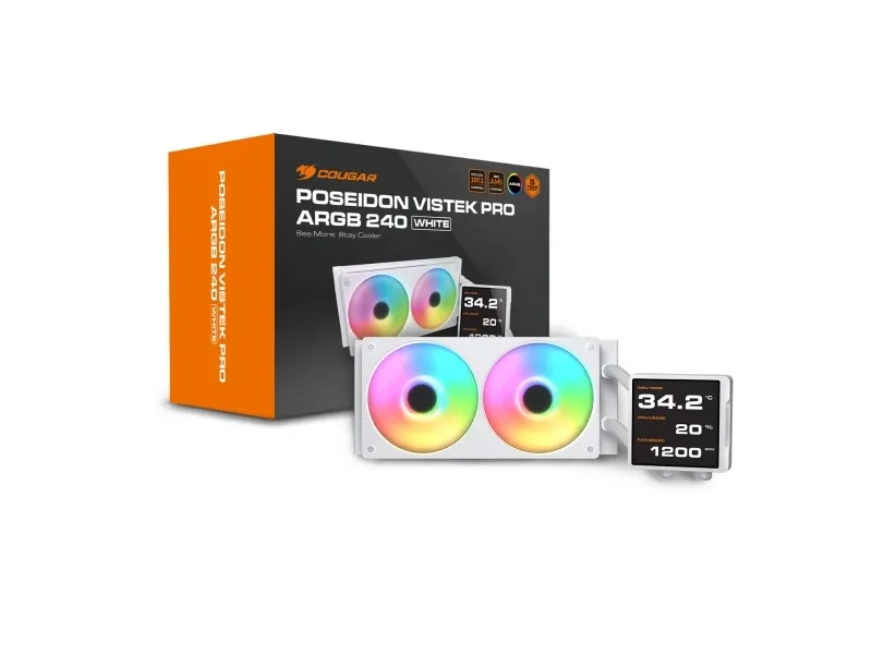 Expanded Cooling Plate An enlarged copper cooling plate increases coolant contact area by 21% compared to the Vistek Pro’s predecessors,effectively managing the thermal output of 14th gen Intel CPUs. This expanded surface area augments heat conduction efficiency, minimizes hotspots and maintains the stability of high-performance processors under intensive operation.COUGAR CPU Water Cooling Poseidon Vistek Pro 240, ARGB, White. Type: All-in-one liquid cooler, Fan diameter: 12 cm, Rotational speed (min): 700 RPM, Rotational speed (max): 2500 RPM, Maximum air pressure: 5.4 mmH2O. Product colour: White