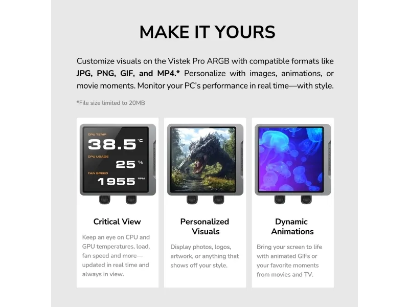 Make It Yours Customize the visuals on the Vistek Pro ARGB using a wide range of compatible formats—including JPG/PNG/GIF/MP4.* Personalize the display with your favorite image, animations, or moments from movies and TV. Track your PCs performance in real time…and real style.