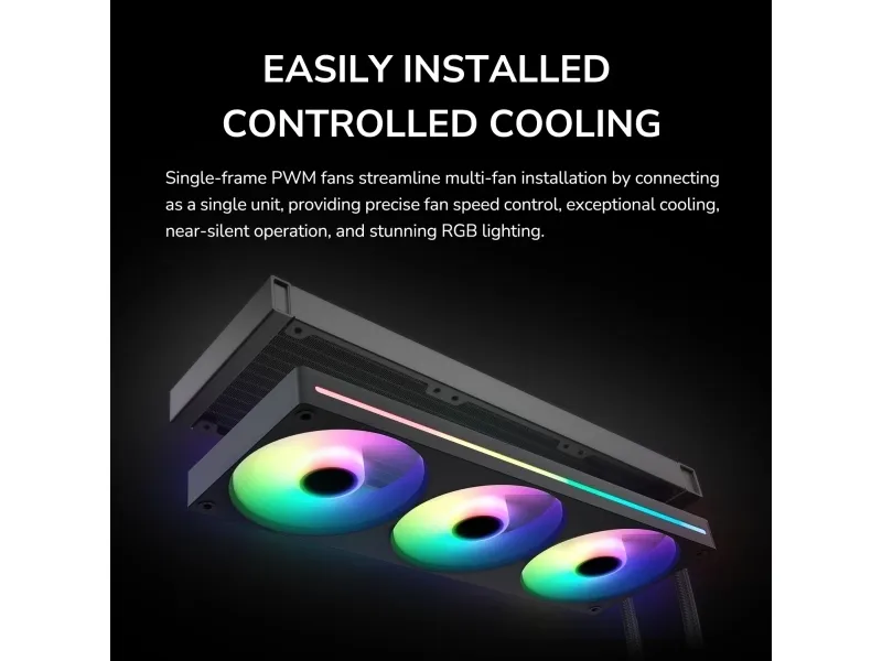 Easily Installed Controlled Cooling Single-frame PWM fans streamline multi-fan installation by connecting as a single unit, providing precise fan speed control, exceptional cooling, near-silent operation, and stunning RGB lighting.