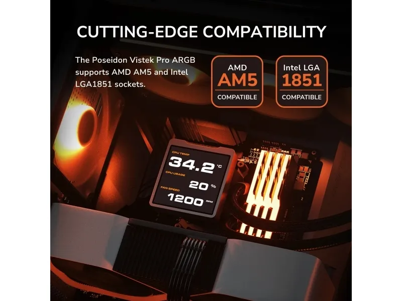 Cutting-Edge Compatibility The Poseidon Vistek Pro ARGB supports AMD AM5 and Intel LGA1851 sockets.