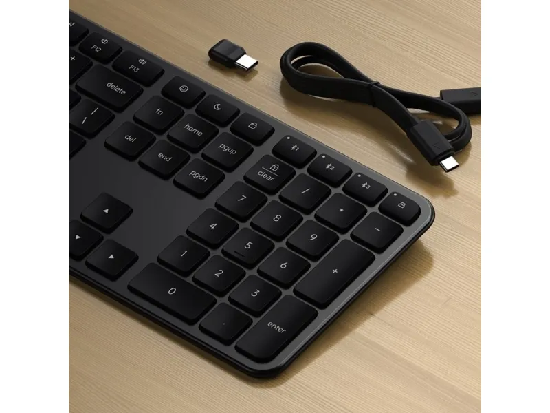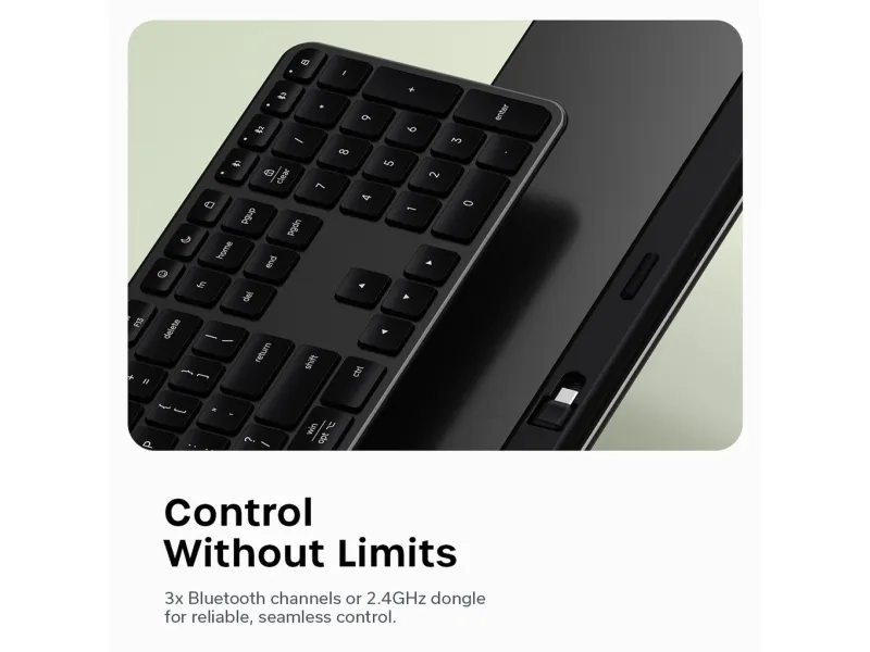 The Satechi EX3 Slim Wireless Keyboard with Nordic layout is a full-size professional keyboard designed for smooth work across devices and operating systems. With quiet scissor keys a dedicated numpad and fast switching between up to four connections it delivers a clean dependable typing experience for both office and home setups.Connect to up to four devices with 4-in-1 wireless connectivityFull-size layout with numpad and navigation keys for faster workflowsQuiet scissor-switch keys in a slim comfortable designMac and Windows support with instant OS key remappingRechargeable removable battery with up to five weeks of use per chargeConnect to up to four devices with 4-in-1 wireless connectivity Pair the keyboard to three devices via Bluetooth and connect a fourth using the 2.4 GHz USB-C receiver. Switch between devices in seconds without needing to re-pair making it easy to move from laptop to tablet to phone throughout the day. Full-size layout with numpad and navigation keys for faster workflows The EX3 is built as a full-size keyboard with a dedicated numpad and a navigation cluster that supports efficient editing data entry and everyday multitasking. It is a practical choice for spreadsheets creative work and general productivity. Quiet scissor-switch keys in a slim comfortable design Low-profile scissor keys provide a precise controlled feel with quieter keystrokes suited to shared workspaces and focused environments. The slim design keeps your typing position comfortable while maintaining a premium clean look on the desk. Mac and Windows support with instant OS key remapping Use the OS switch to configure the keyboard for Mac or Windows. Key functions and controls align immediately so you can work naturally across different computers without relearning shortcuts. Rechargeable removable battery with up to five weeks of use per charge The EX3 runs on a rechargeable battery designed to last up to five weeks on a single charge. The battery is removable and supports USB-C charging designed with long-term usability in mind and aligned with the EU 2027 replaceability standard. Package includes1x Satechi Slim EX3 Wireless Keyboard - Space Black1x USB-C to USB-C charging cable (0.8 m)1x User manualProduct specificationsBrand: SatechiColour: Space BlackBluetooth version: 5.3Bluetooth connections: up to 3 devices2.4 GHz connection: 1 device via 2.4 GHz USB-C receiverCharging port: USB-C (charging only)Length: 42.64 cmWidth: 11.93 cmHeight: 1.67 cmWeight: 552 g