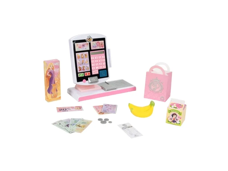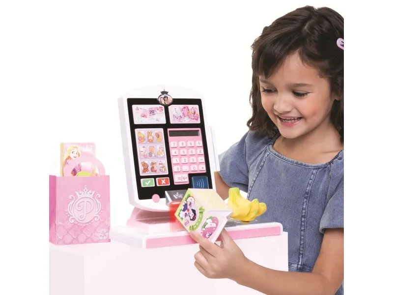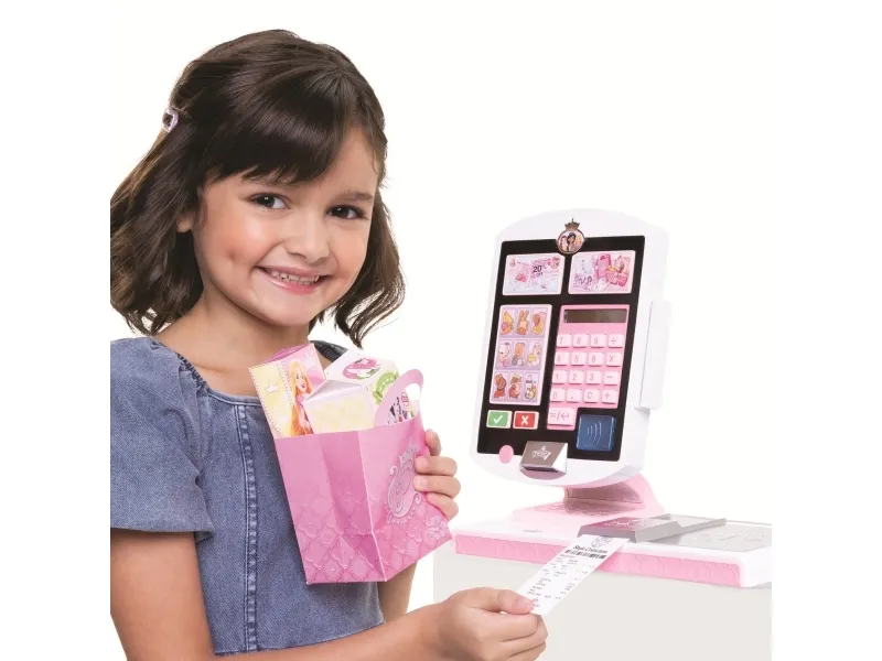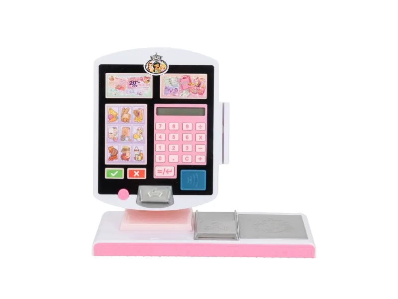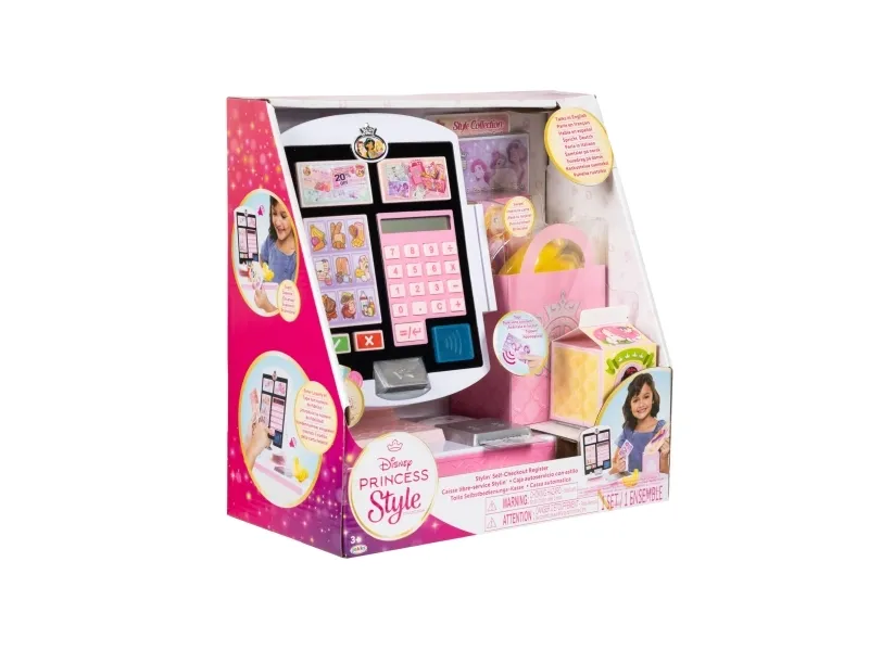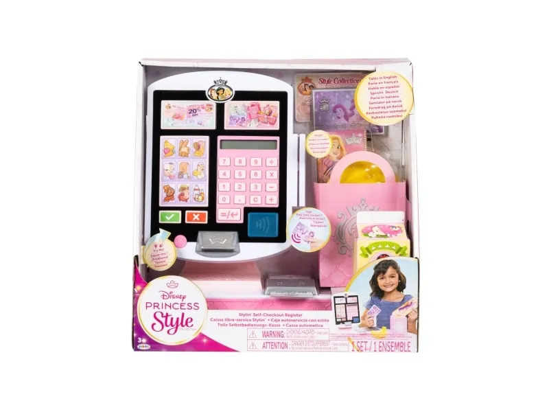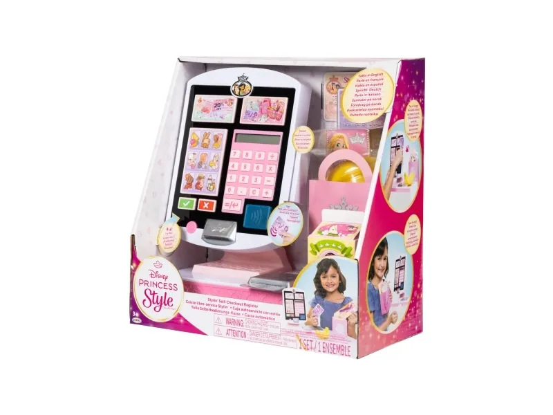 Disney Princess Stylin’ Self-Checkout Register – Leg med indkøb! Indkøb har aldrig været så sjovt med Disney Princess Stylin’ Self-Checkout Register! Denne legetøjs-kasse taler på 10 forskellige sprog – tryk på den hvide knap bagpå og vælg dit ønskede sprog! Find stregkoden og scan dine varer med den “ægte” fungerende infrarøde scanner. der både lyser op og laver lyde. Små shoppere kan indtaste deres loyalitetsnummer på tastaturet og blive en “Royal” kunde! Leg at “veje” dine varer på vægten. inden de pakkes i indkøbsposen. “Klar til betaling?” Tryk eller svej din legetøjskreditkort og se kassen lyse op med en “GODKENDT”-besked! Tag din kvittering og afsted med varerne! Med over 20 indkøbsfraser. fungerende lommeregner. kuponer og kvittering bringer denne legetøjskasse hele indkøbsoplevelsen til live!