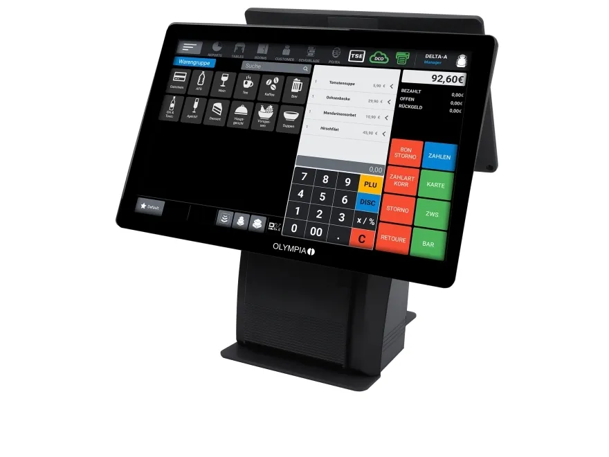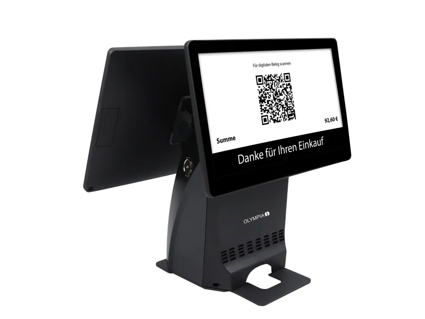 Olympia T215DK. Display diagonal: 38.1 cm (15"), Display type: LCD. Chassis type: All-in-One, Product colour: Black. Operating system installed: Android 11. Print technology: Direct thermal, Maximum printing width: 8 cm. Width: 390 mm, Depth: 220 mm, Height: 357 mm