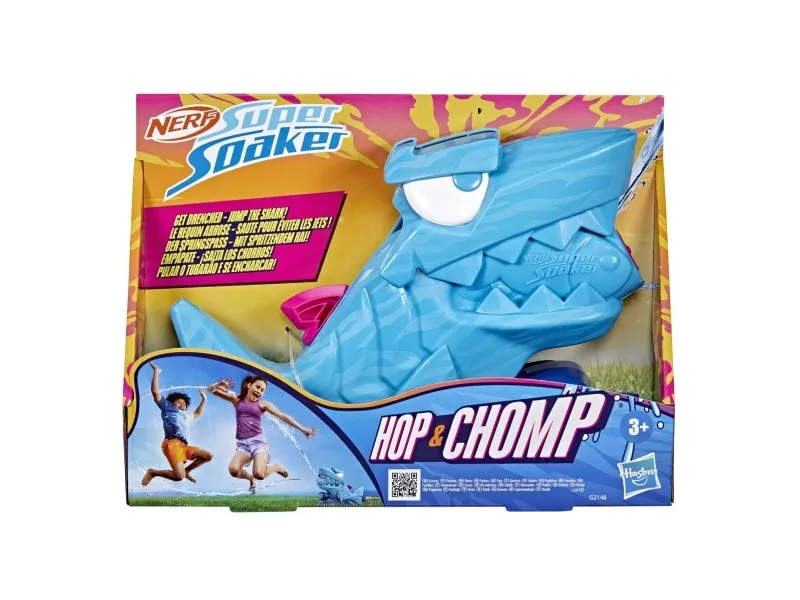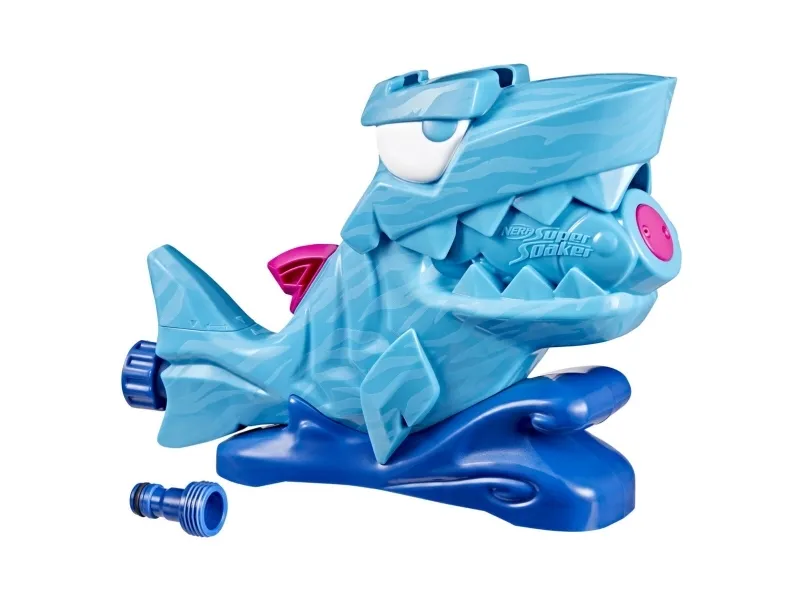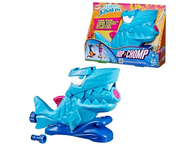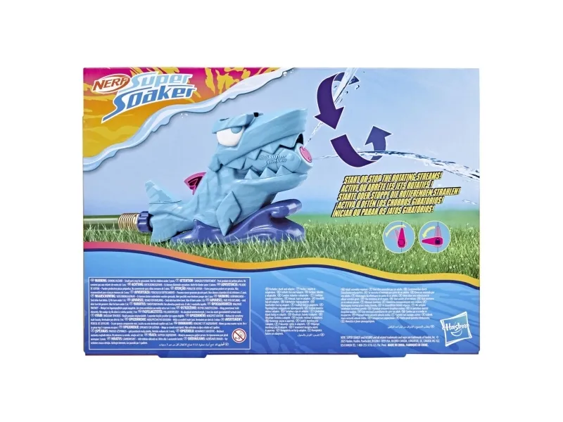Når haien begynner å tygge, starter vannleken! Nerf Super Soaker Hop & Chomp-vannleken har en hai som skyter ut to roterende vannstråler fra de bitende kjevene! Barn kan leke på mange måter: hopp over strålene for å unngå spruten, eller løp gjennom for å bli klissvåt. Haien åpner og lukker munnen for ekstra chomp-moro. Den er enkel å bruke: Bare koble haien til hageslangen din. Du kan justere hvor raskt strålene roterer, eller låse dem i en fast vinkel. Haien er den perfekte kompisen for varmt sommervær som får barna ut og i gang med aktiv utelek. Nerf Super Soaker-vannleker er flotte gaver til morsom og aktiv lek som virkelig spruter! (Hageslange kreves, følger ikke med.) NERF SUPER SOAKER og HASBRO samt alle tilhørende varemerker og logoer er varemerker tilhørende Hasbro, Inc.