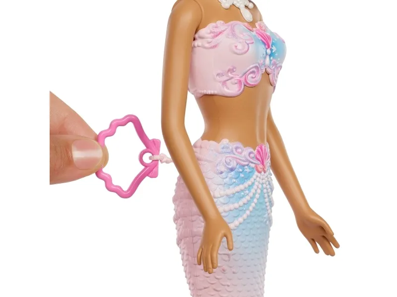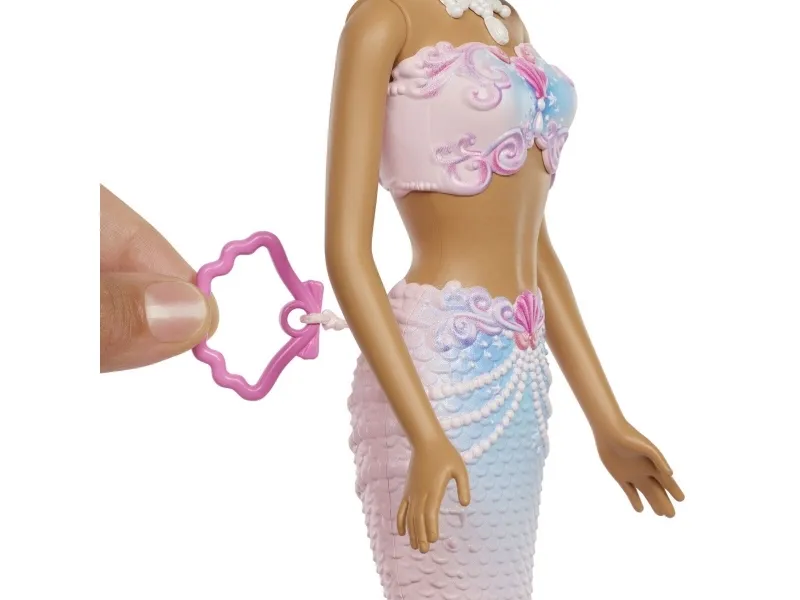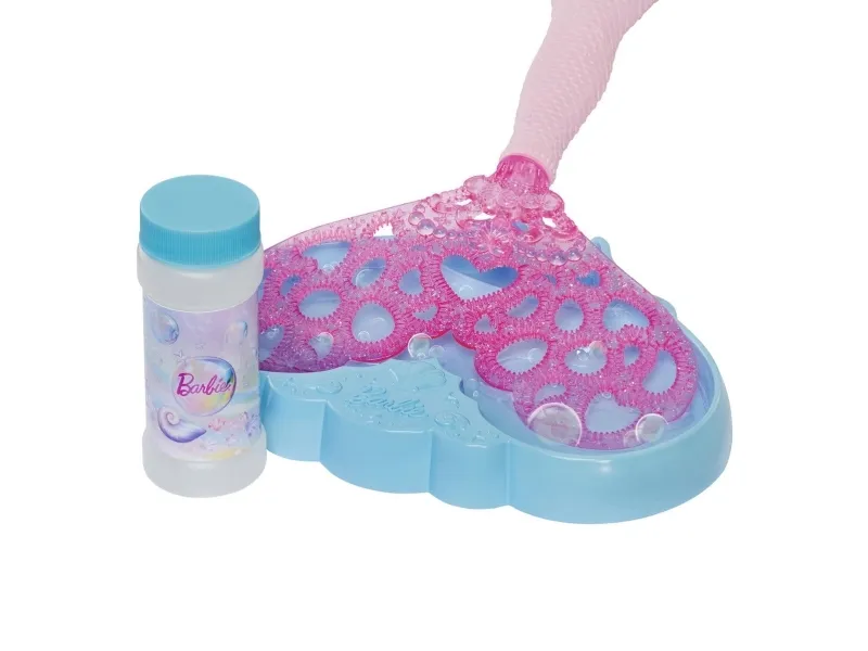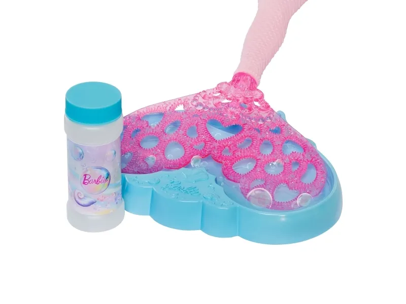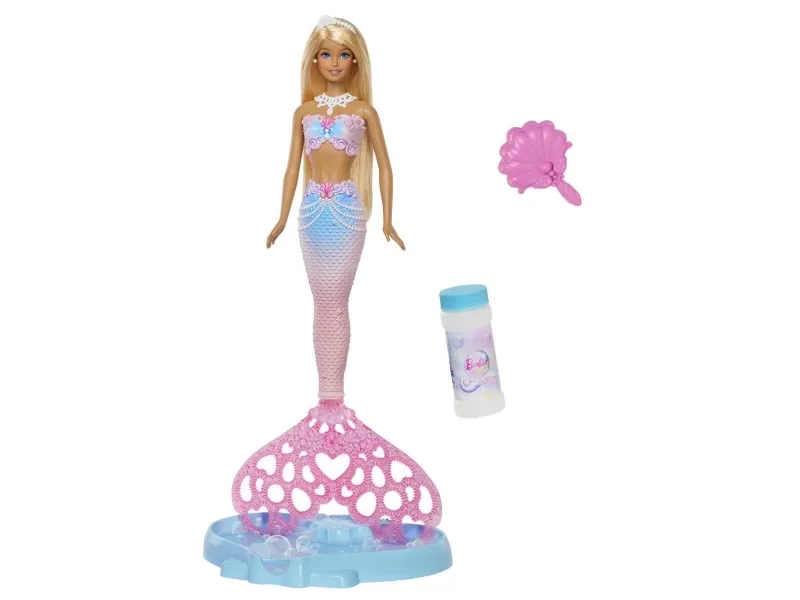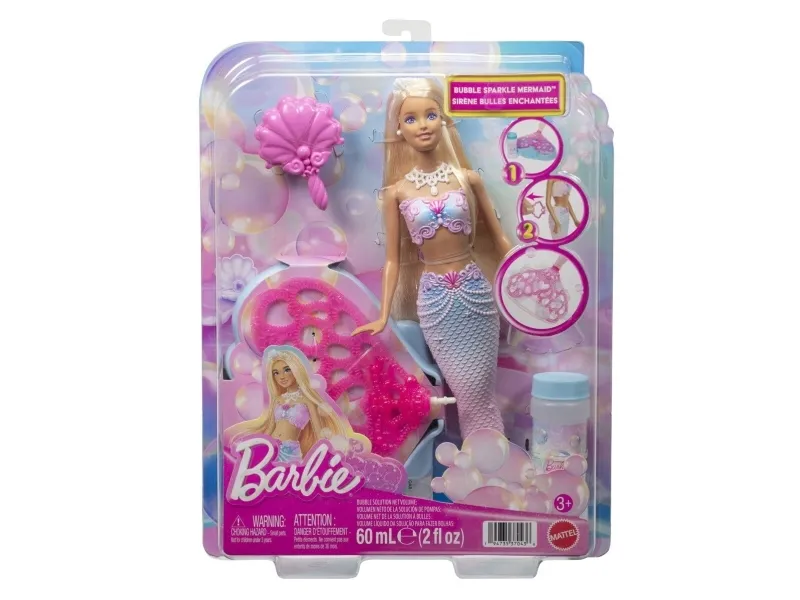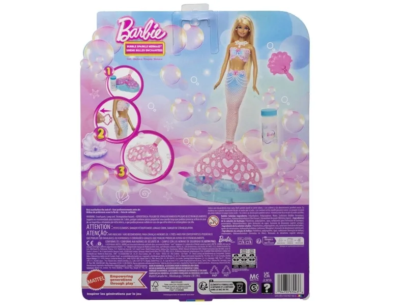 Åpne opp en verden av boblefylte eventyr med Barbie Bubble Sparkle Havfrue-dukke! Barbies havfruehale er ekstra magisk – utskjæringene lager fantastiske bobler! Hell boblevæsken (inkludert) i det skjellformede brettet og dypp halefinnen i væsken. Dra i skjellfanen på halen, se den spinne og send masse bobler ut i luften! Mellom boblene er det enda mer moro – lek undervannshistorier og bruk den medfølgende hårbørsten til å style dukken sitt lange, glitrende hår. Barbie Bubble Sparkle Havfrue er en fortryllende gave til barn fra 3 år og oppover, spesielt de som elsker bobler og fantasiverdener! Dukken kan ikke svømme eller stå uten støtte. Farger og dekorasjoner kan variere.