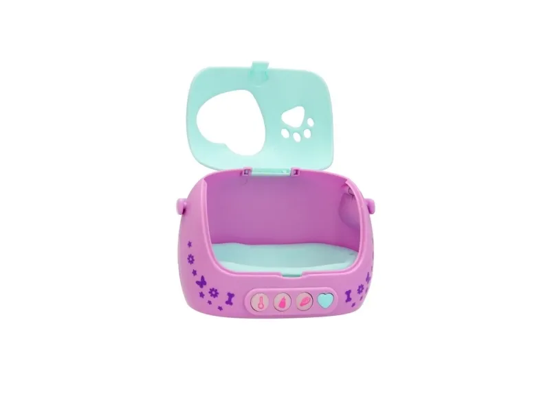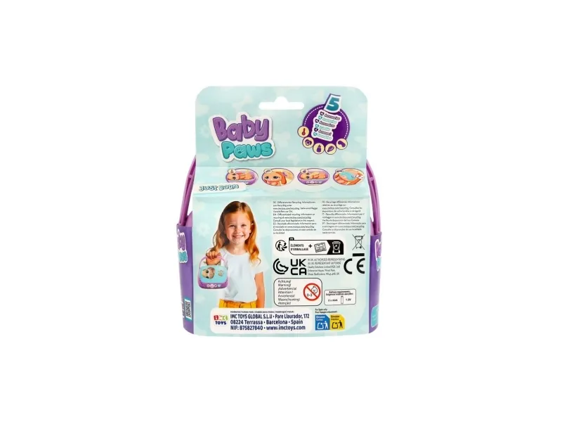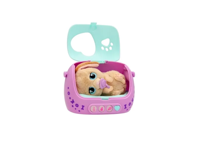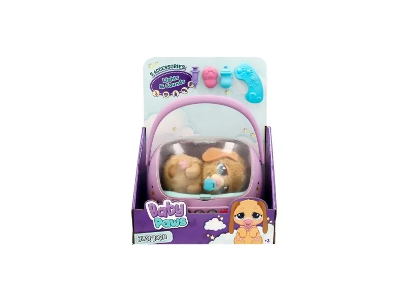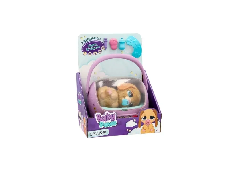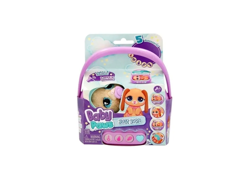 New Baby Paws er her! Disse små søtnosene trenger masse kjærlighet og omsorg. Trykk på hjerteknappen og se et lite lys dukke opp – det forteller deg akkurat hva ditt nyfødte kjæledyr trenger for å være lykkelig! Finn riktig tilbehør og begynn å leke med din lodne venn. Du kan gi medisin med sprøyten, mate med flasken, eller gjøre dem fine med børsten. Når det er tid for en lur, trykk og hold inne knappen for å aktivere sovemodus, ta på den søte sovemasken og nyt en koselig lur sammen! Ta med deg babyen overalt i sin spesialbærer med praktisk håndtak.