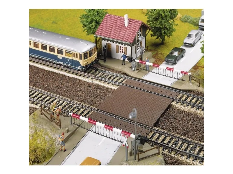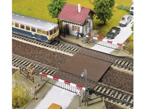 H0 jernbaneovergang med vogterhus Overgangen kan indbygges i en- eller flersporede, lige strækninger af alle sportyper. Denne jernbaneovergang er udstyret med en elektromotor, der lydløst og realistisk langsomt åbner og lukker bommene. Inkl. elektromotor
