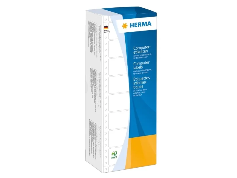 Computer labels continuous with sprocket holes. In best quality: guaranteed continuous, without interruption of the stuck. Trouble-free running, optimum filing and perfect print results. Made of high grade, wood-free paper. Permanent in use.